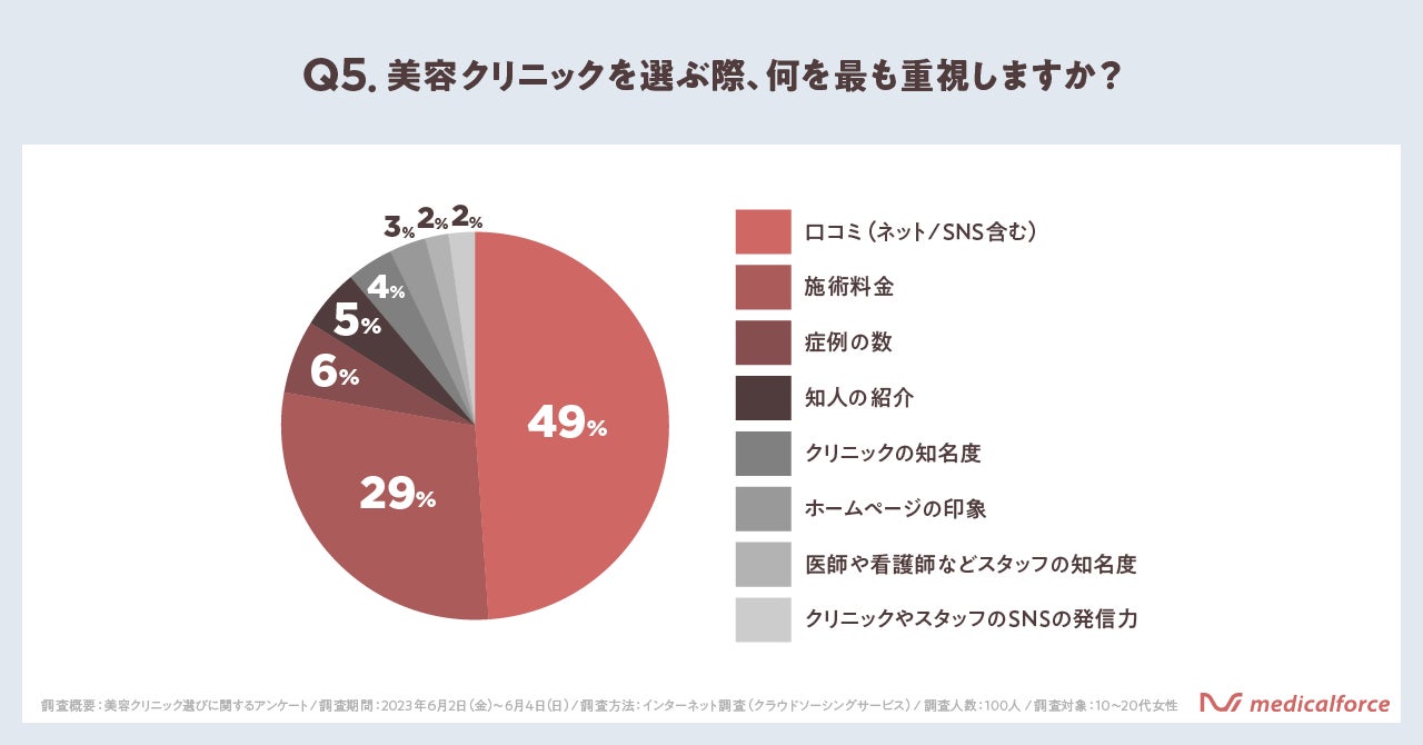 最後に「美容クリニックを決める際、何を最も重視しますか?」と質問したところ、『口コミ※ネット/SNS含む(49%)』と半数近くが回答し、次いで『施術料金(29%)』『症例の数(6%)』『知人の紹介(5%)』と続きました。