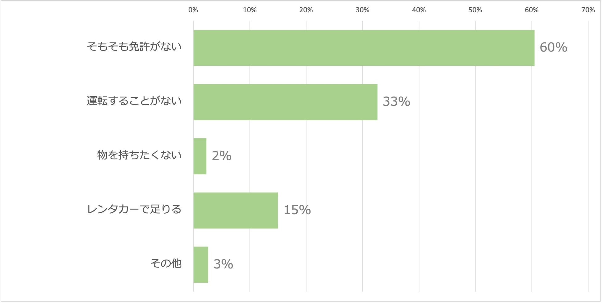 また、免許があっても運転することがないことや、レンタカーで足りるといった意見から、普段車を前提とした生活をしておらず、必要な際はレンタルで事足りることがわかる。
