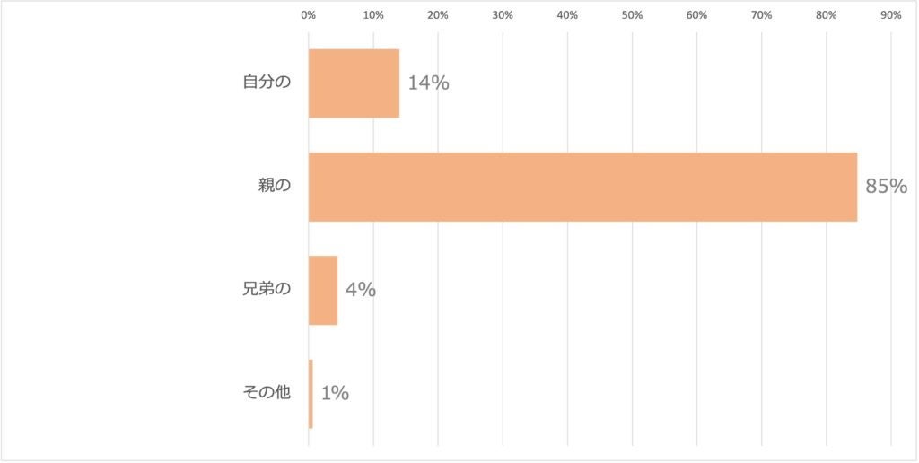 Q1で「はい」と回答した方に「Q2.どなたの車ですか?(n=671)」と質問をしたところ、自己所有の割合は14%で、自宅にある車のほとんどが親の車であることがわかった(85%)。
