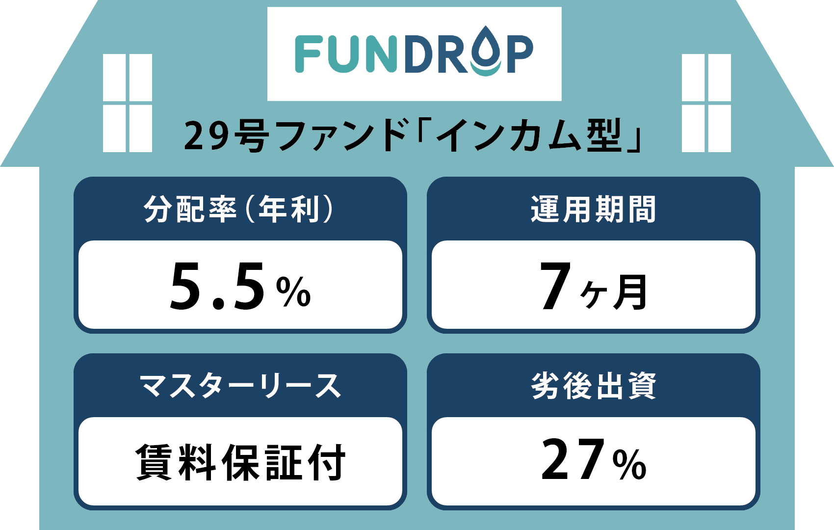 FUNDROP 29号ファンドは、利回り(年利)5.5%、賃料保証付きにて運用