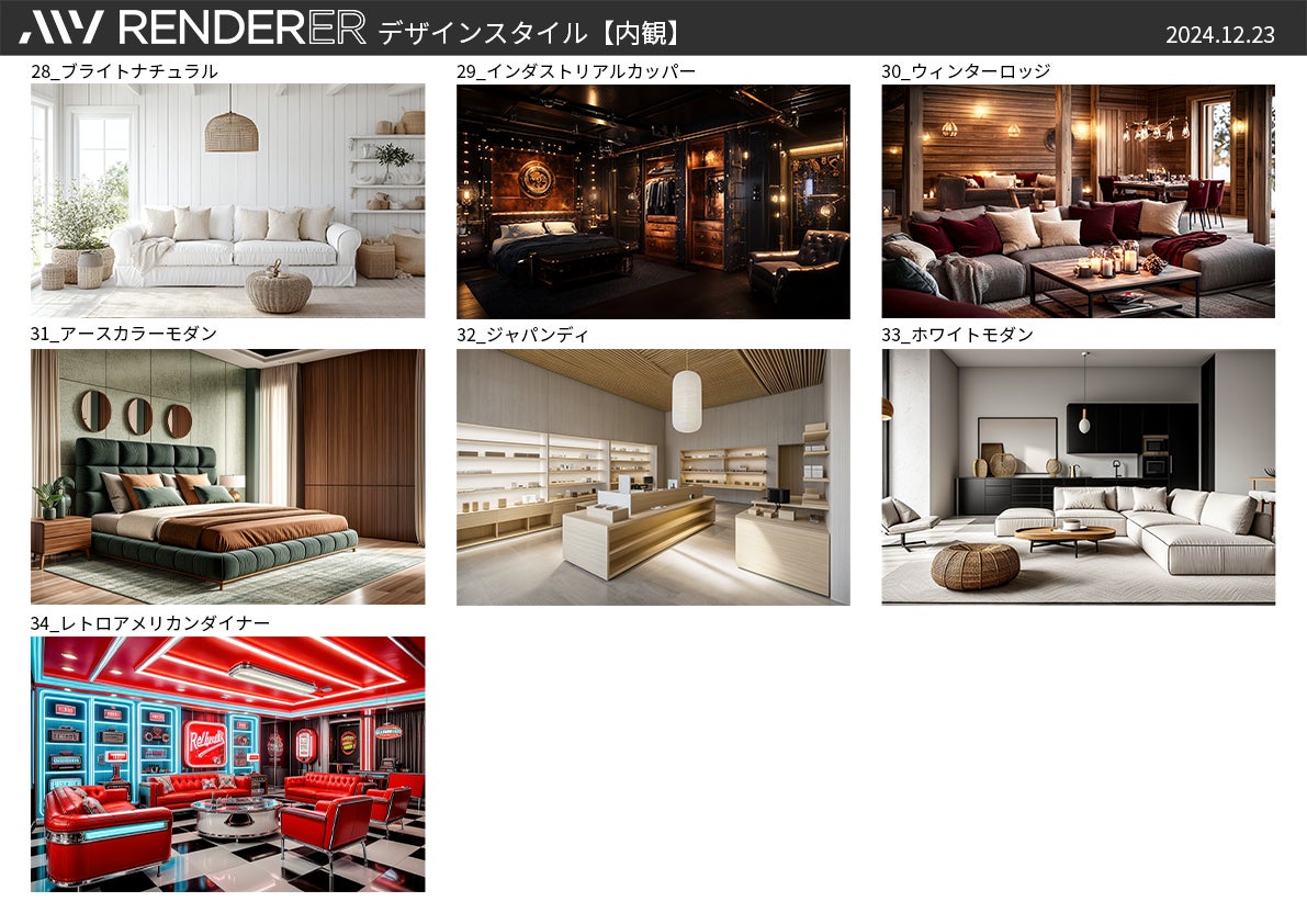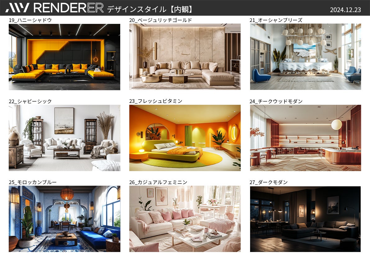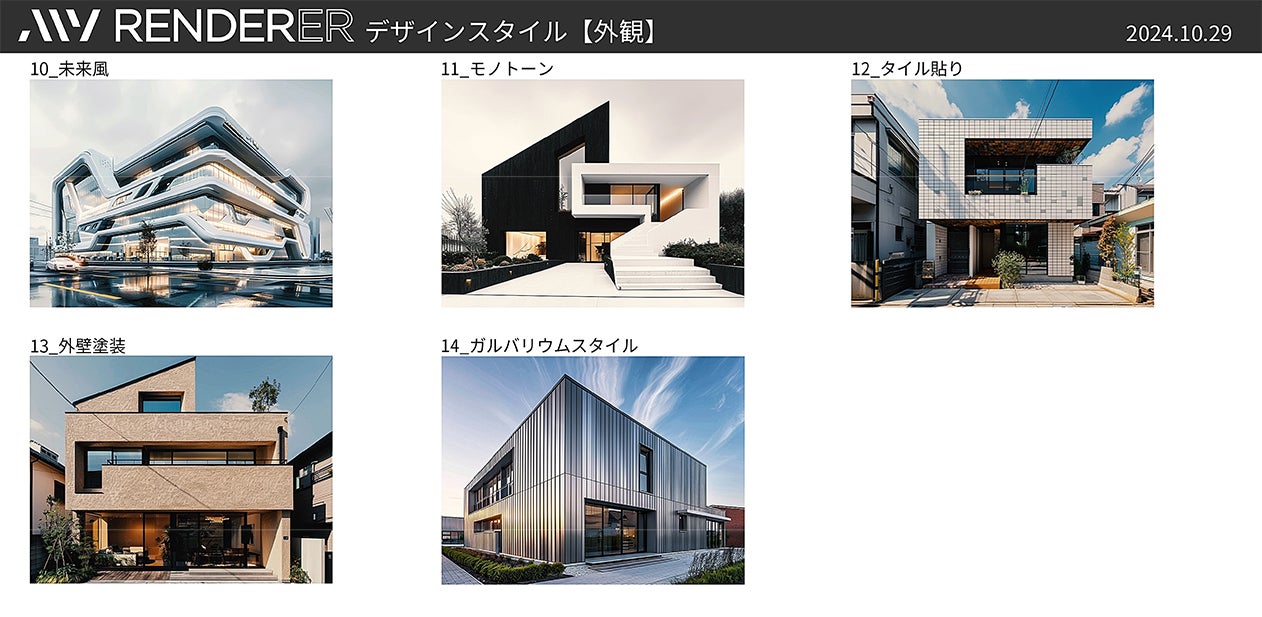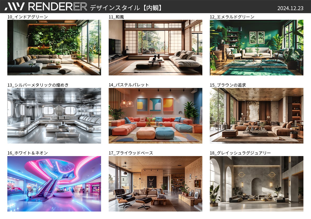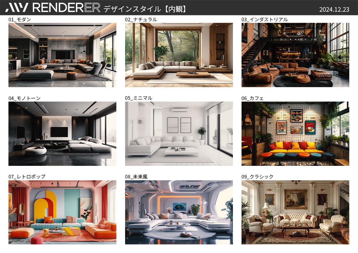 MyRendererは豊富なデザインスタイルを用意しています。現在、内観スタイルは34種類、外観スタイルは14種類。デザインスタイルは月に4種類程度のペースで開発・更新されており、最新のトレンドに対応しています。あなたのプロジェクトに最適なスタイルを見つけ、他にはない独自のビジュアルを実現しましょう。