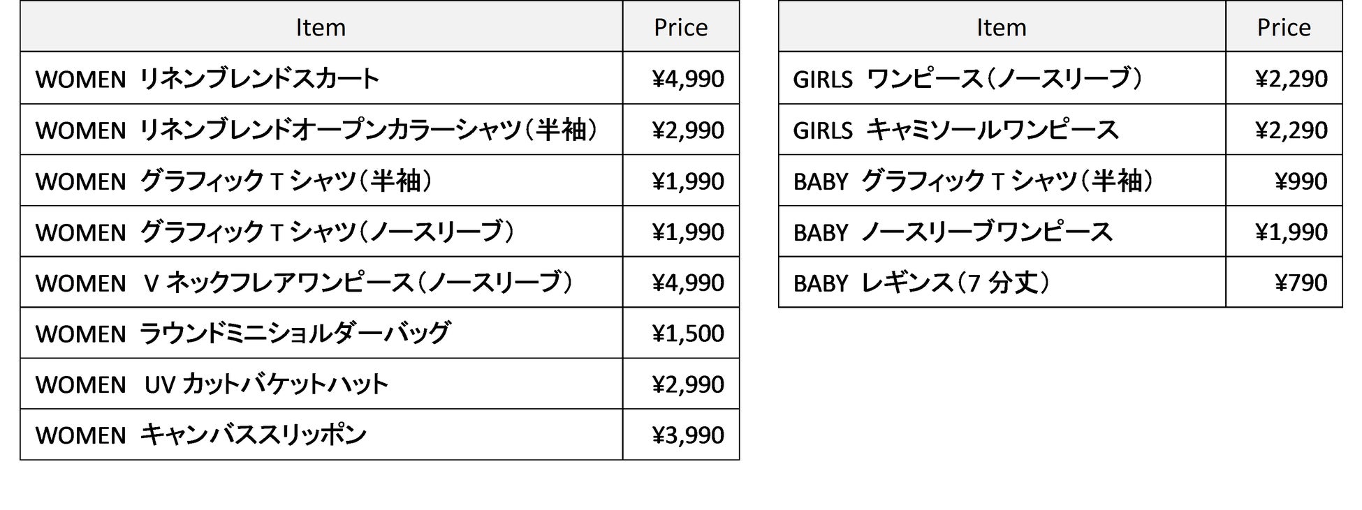 商品ラインナップ:ウィメンズ8アイテム、キッズ2アイテム、ベビー3アイテム