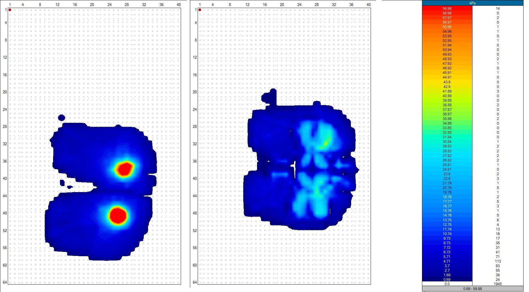 普通に座った場合のピーク圧⼒(90.29kpa)に対し、immersepadheadの上に座るとピーク圧⼒(39.39kPa)が56%減圧しました。