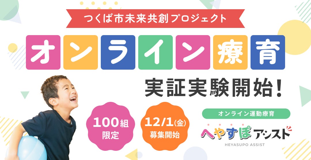 実証事業では、つくば市の小学校1~3年生の方を対象に、2026年1月からの6カ月間、「へやすぽアシスト」で提供するオンラインレッスンなど各種サービスを無料で提供します。理学療法士・作業療法士によるマンツーマンのオンライン療育を通じて、つくば市の発達に課題を抱えるお子様を支援します。