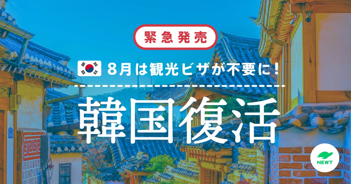 韓国政府は、8月の1か月間限定で日本からの観光客を対象にビザなしでの渡航を認めることを決定しました。これによって、韓国への渡航がより現実的なものとなった為、『NEWT』は、急遽、韓国ソウルツアーの販売を開始することになりました。コロナ禍前とは違う手続きも必要になりますので、『NEWT』では、オンラインで徹底的にカスタマーの皆さまの渡航をサポート、「すぐに行ける韓国」を実現いたします。
