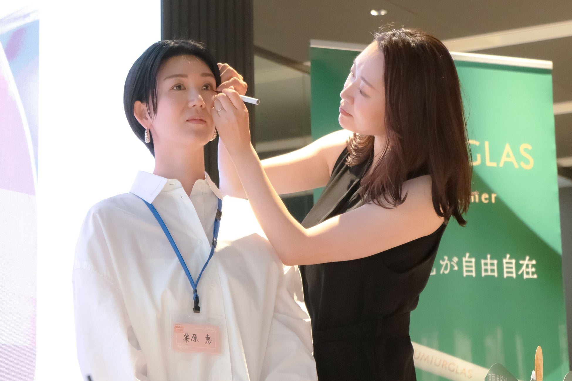 メイクのデモンストレーションでは、栗原 恵さんをモデルとして実際にタッチアップしながら「スポーツ中でも“落ちにくい”メイクのコツ」を解説。デモンストレーション中には、参加者の質問やメイクテクニックの驚きや感動の声が上がるなど、会場は大盛り上がり。