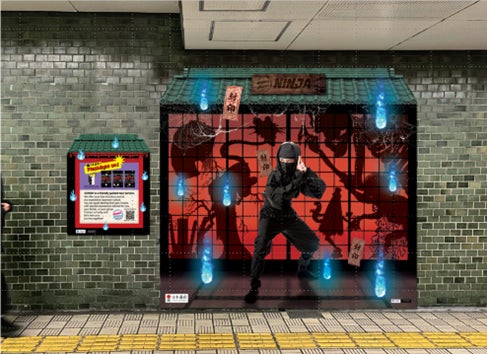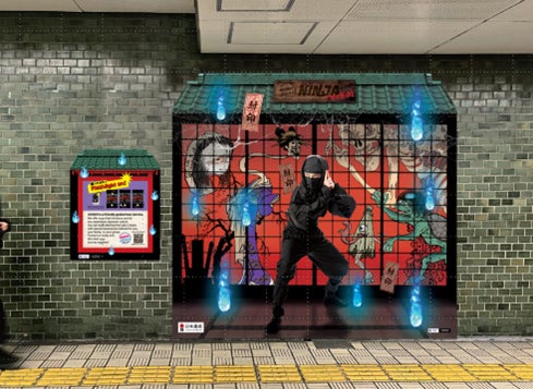 Osaka Metro本町駅連絡通路に「ニンジャ」ボードを展示。撮影すると妖怪が登場するトリックアートです。