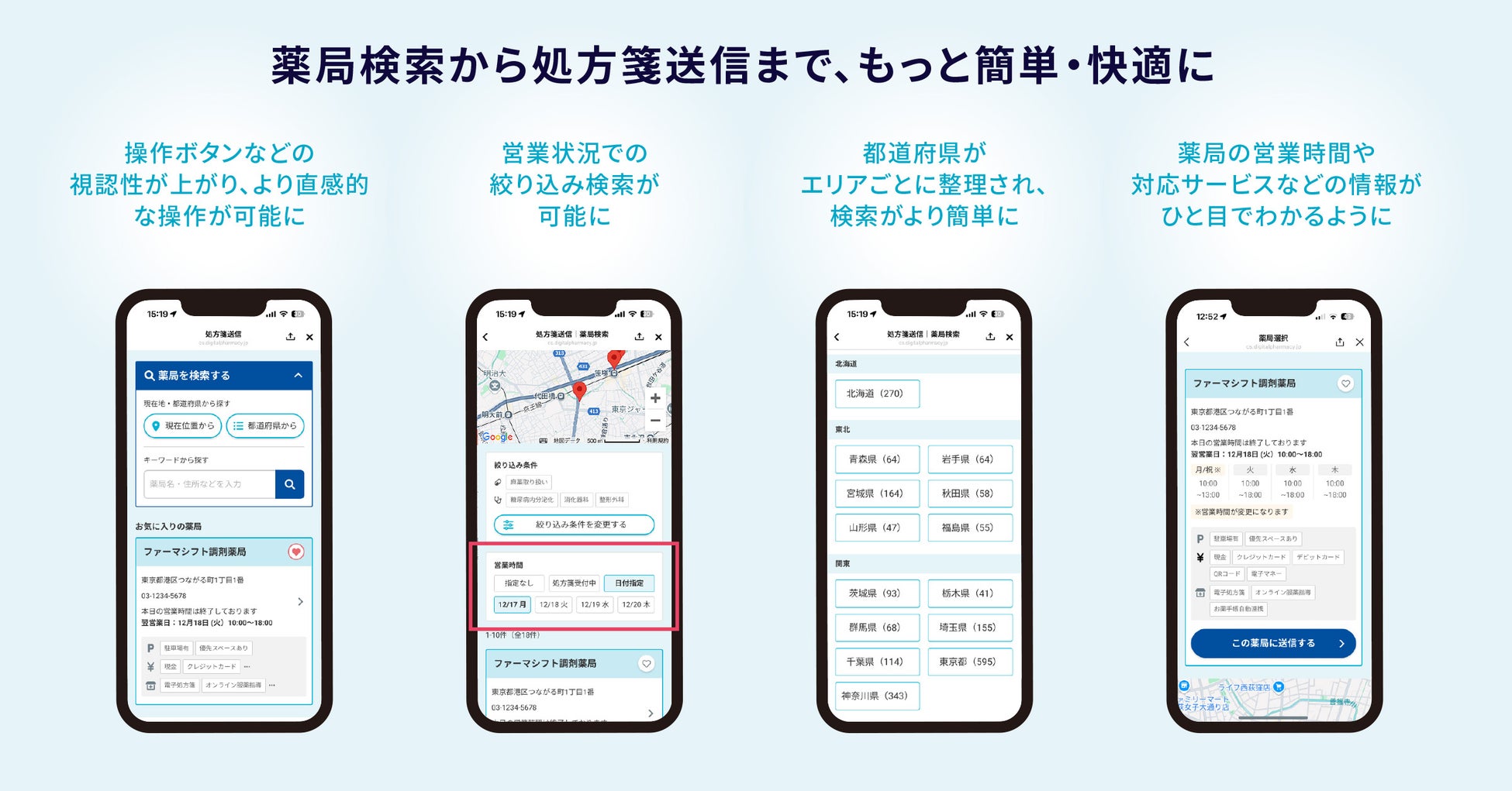 最も利用されている「処方箋送信」機能では、操作ボタンの視認性を高めて直感的に操作できるよう改善しました。さらに、薬局の営業状況による絞り込み検索の追加や、エリアごとに整理された都道府県検索、営業時間・対応サービスの表示を改善し、患者さんが薬局検索から処方箋送信までをよりスムーズに行える導線へ進化しました。