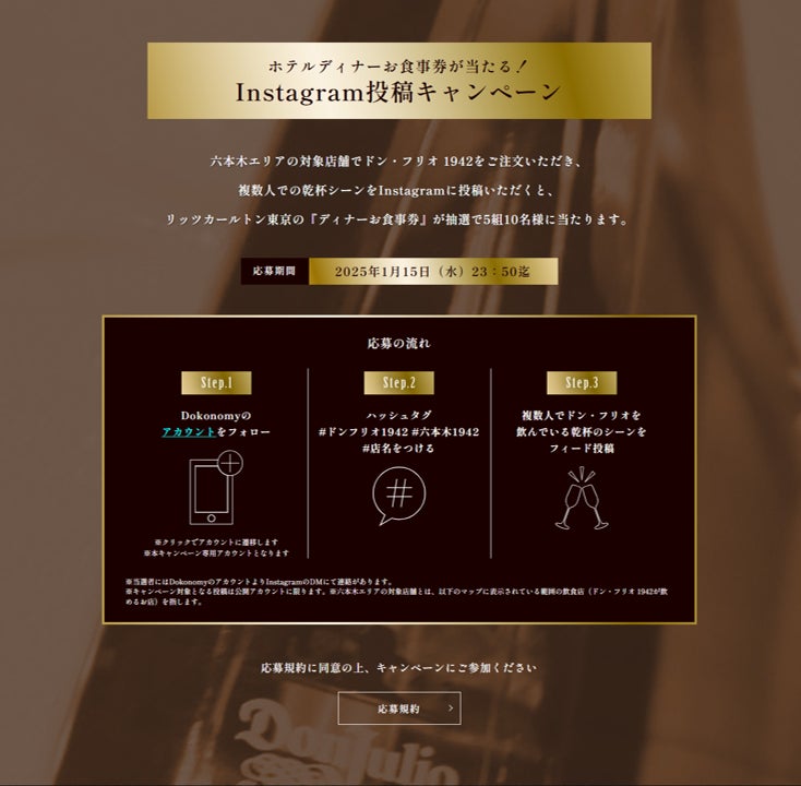 セレブリティたちの集まるパーティーシーンのドリンクといえば、シャンパーニュが定番でしたが、世界ではラグジュアリーテキーラが選ばれる機会が増えています。「ドン・フリオ 1942」を注いだフルートグラスでの乾杯は、まさに“新しいセレブレーションのカタチ”。この度、みなさまに特別な乾杯をご体験いただけるキャンペーン「Roppongi Celebration ~Toast with Don Julio 1942~」を日本屈指のラグジュアリーエリア・六本木で開催します。期間中は、対象店舗で「ドン・フリオ 1942」をご注文いただき、乾杯シーンをInstagramに投稿することで、豪華ホテルディナーが当たる他、六本木交差点付近にてOOH広告も掲出します。