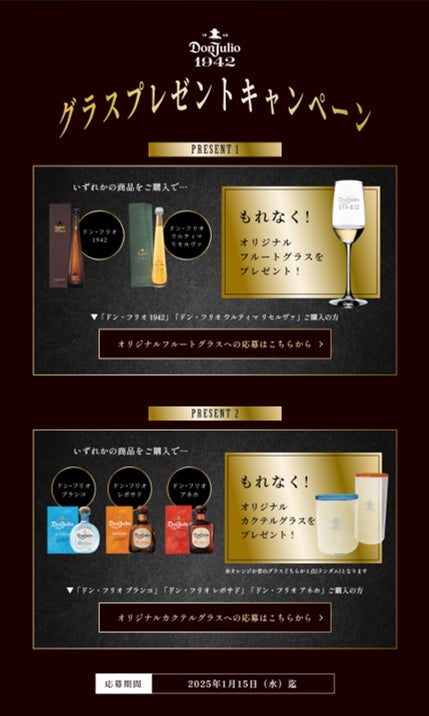 また、2025年1月15日(水)迄の期間中、ドン・フリオシリーズの商品を対象の小売店等でご購入いただいた方には、ドン・フリオをより楽しんでいただけるオリジナルグラスがプレゼントされるキャンペーンを実施いたします。詳細はキャンペーンサイトをご覧ください。