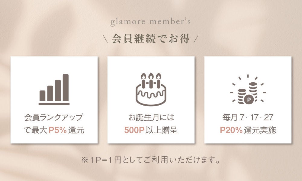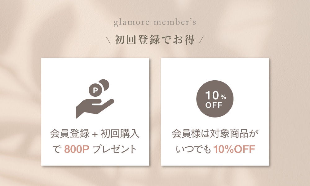 さらに、公式サイトから会員登録すれば、対象商品はいつでも10%オフで購入可能。会員登録後、初回購入時に800Pのポイントをもらえるほか、会員ランクアップでポイント還元率が最大5%になったり、お誕生日クーポンやお得な情報ももらえたりといいことづくし。公式サイトでの買い物なら送料は一律560円ですが、税込3,980円以上で送料無料なので、グラモアブラ1枚でも送料は無料になります。