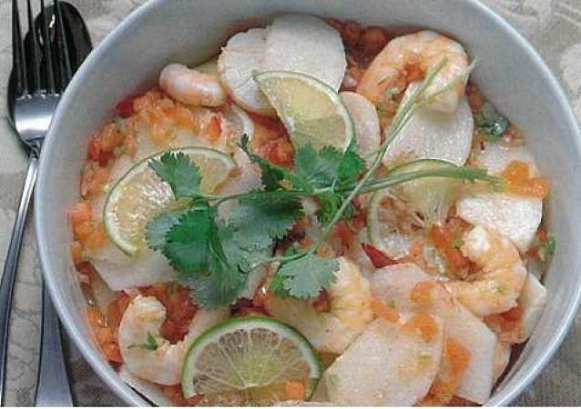 1.軽くゆでて厚さを3等分に切ったほたて貝柱(刺身用)とゆでて殻をむいた大正えび8~12尾に、塩こしょう、ライム汁、オリーブオイルをかけて、1時間ほどマリネする。