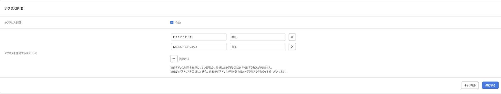 アクセスを許可するIPアドレスを登録することで、組織へのアクセスを特定のIPアドレスに限定することができます。