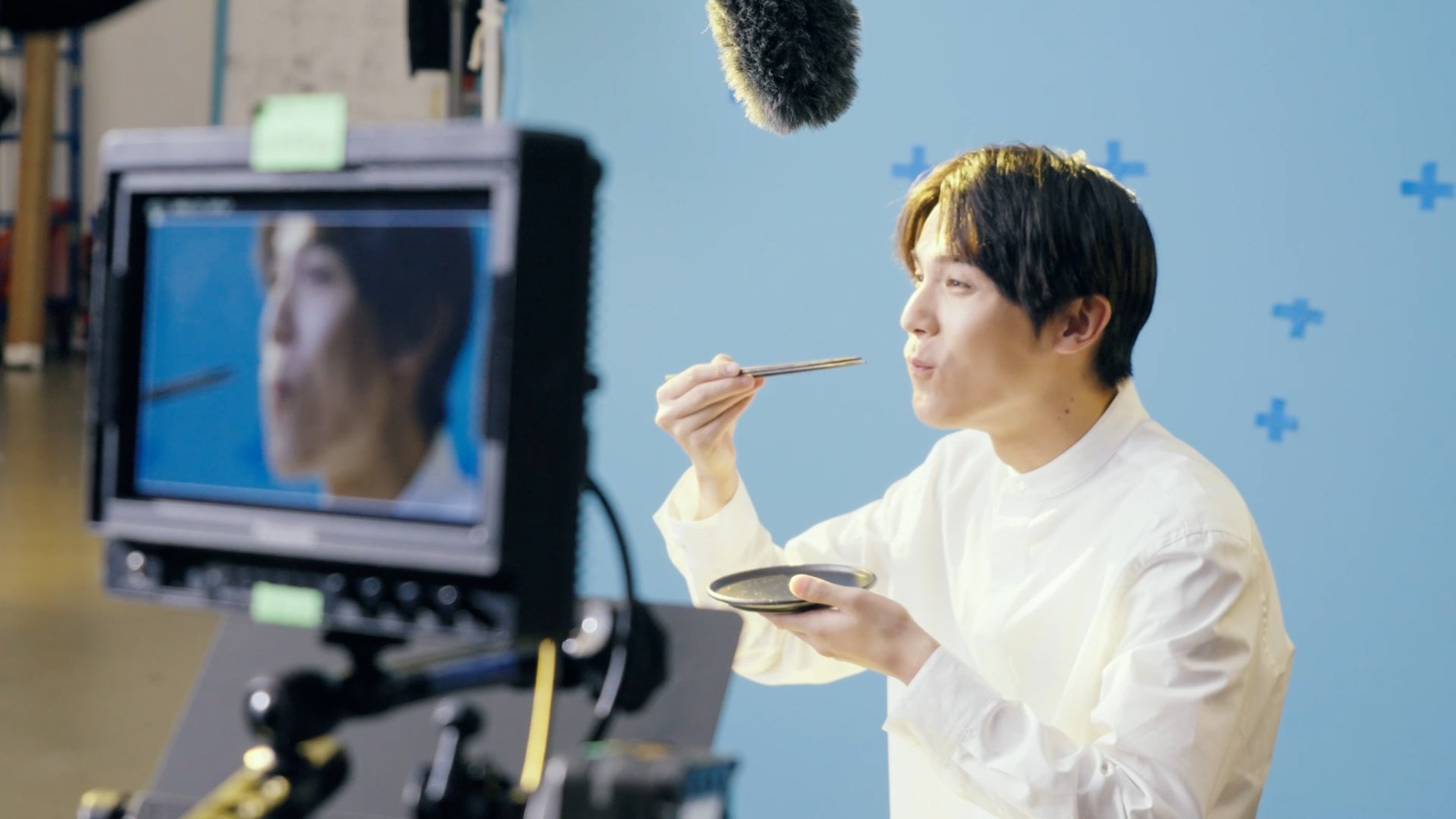 撮影当日、衣装合わせを行い、颯爽と明るい表情でスタジオ入りされた中川大志さんを見たスタッフの印象は「きれい!」の一言でした。「まいたけをプレミアムなきのこ」と強く表現したい、とお伝えしたところ、「まいたけ大好きです。ぜひ、いいCMを作ります」との言葉をいただきました。お好きとはいえ、約30回に及ぶ試食シーンは、きっと満腹になるまで召し上がられたに違いありません。今回のCMは中川さんの登場シーンだけでなく、「極」の存在感を際立たせるためのライティングや動き、背景の変化や、箸の上げ下げに至るまで随所に細かいこだわりがあります。中川さんは「こんなに大きなまいたけは初めて見ました。食感・味すべて絶品でした」とのこと。「これからはスーパーでも『極』を確認して買って、たくさん食べます!」との力強いお言葉もいただきました。