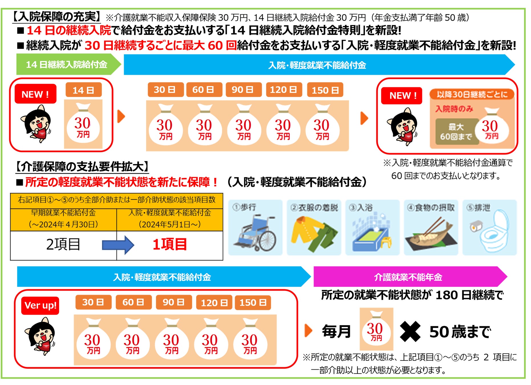 これらの改定により「介護就業不能収入保障保険」は、これまで以上に入院・介護等による働けなくなったときのリスクに備えることが出来るようになりました。