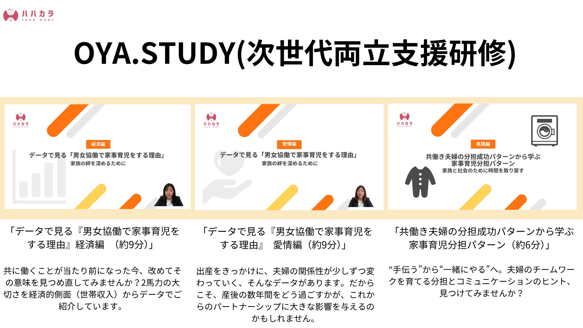 株式会社ハハカラ(本社:東京都品川区、代表取締役:片田 櫻子、以下:ハハカラ)は、2025年4月〜9月にかけて、上場企業4社(三井金属グループ/キングジム/サーラグループほか1社)計336名を対象に、共働き時代の“夫婦協働”と“職場の共助”を同時に扱う動画研修プログラム「OYA.STUDY(次世代両立支援研修)」を実証導入しました。(アンケート回答者:249名)