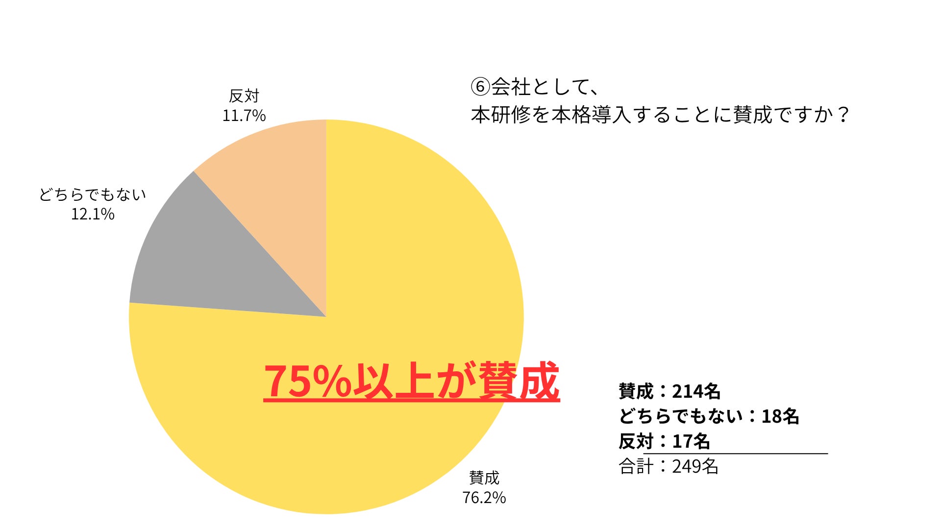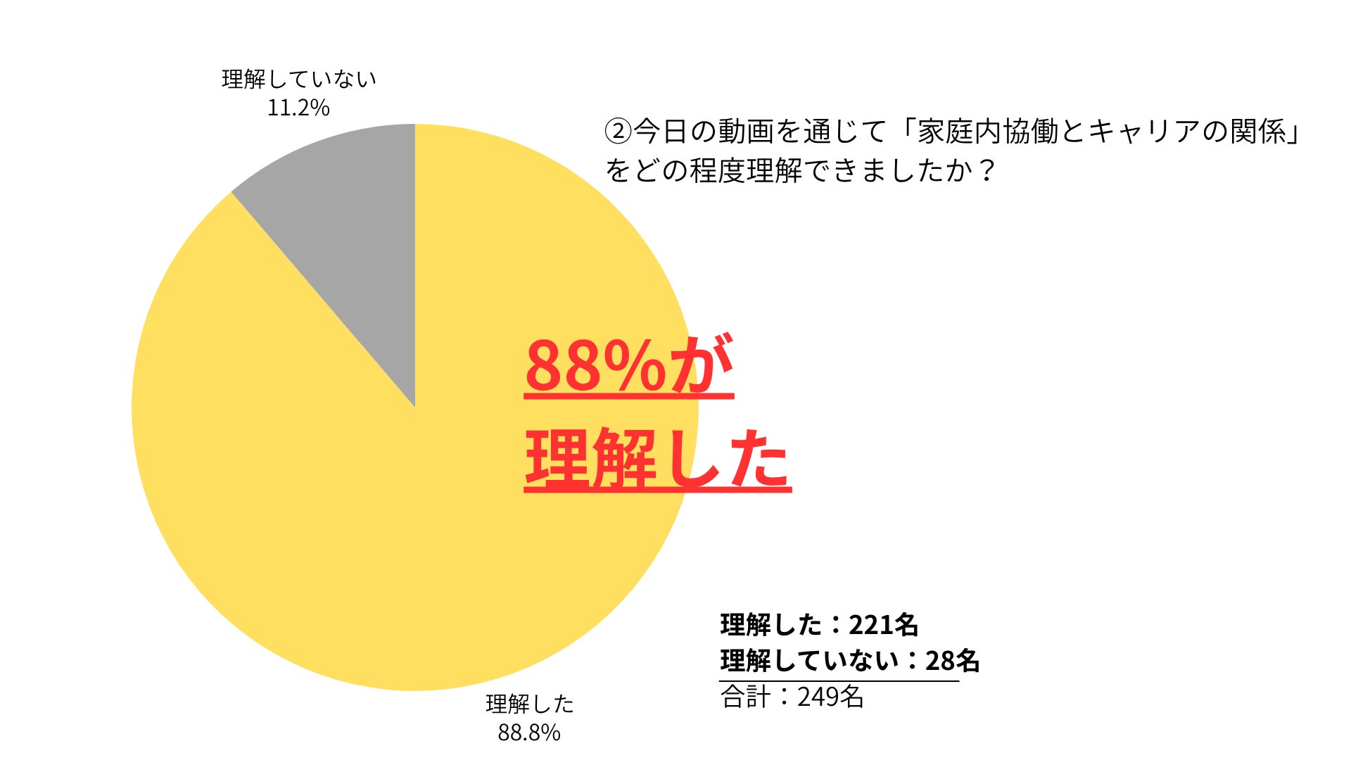 この研修は初めての試みであり、家事の業務分担まで会社が踏み込むことに対して、どのように受け取られるか不安があったが、「共働き・共育て」に対する理解向上に繋がり、予想以上にポジティブな反応が多く、実施して良かったと感じています。
