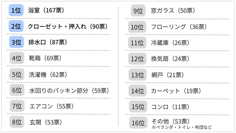 「梅雨の時期だからこそ重点的にお掃除している箇所を教えてください」という質問では、湿気が溜まりやすい場所が多く票を集めていました。