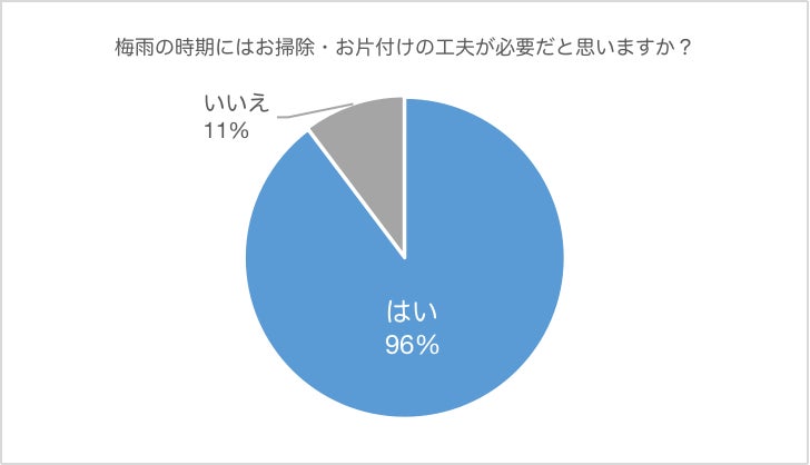 今回のアンケートでは、全体の96%の人が「 梅雨の時期にお掃除・お片付けの工夫が必要」と回答しました。