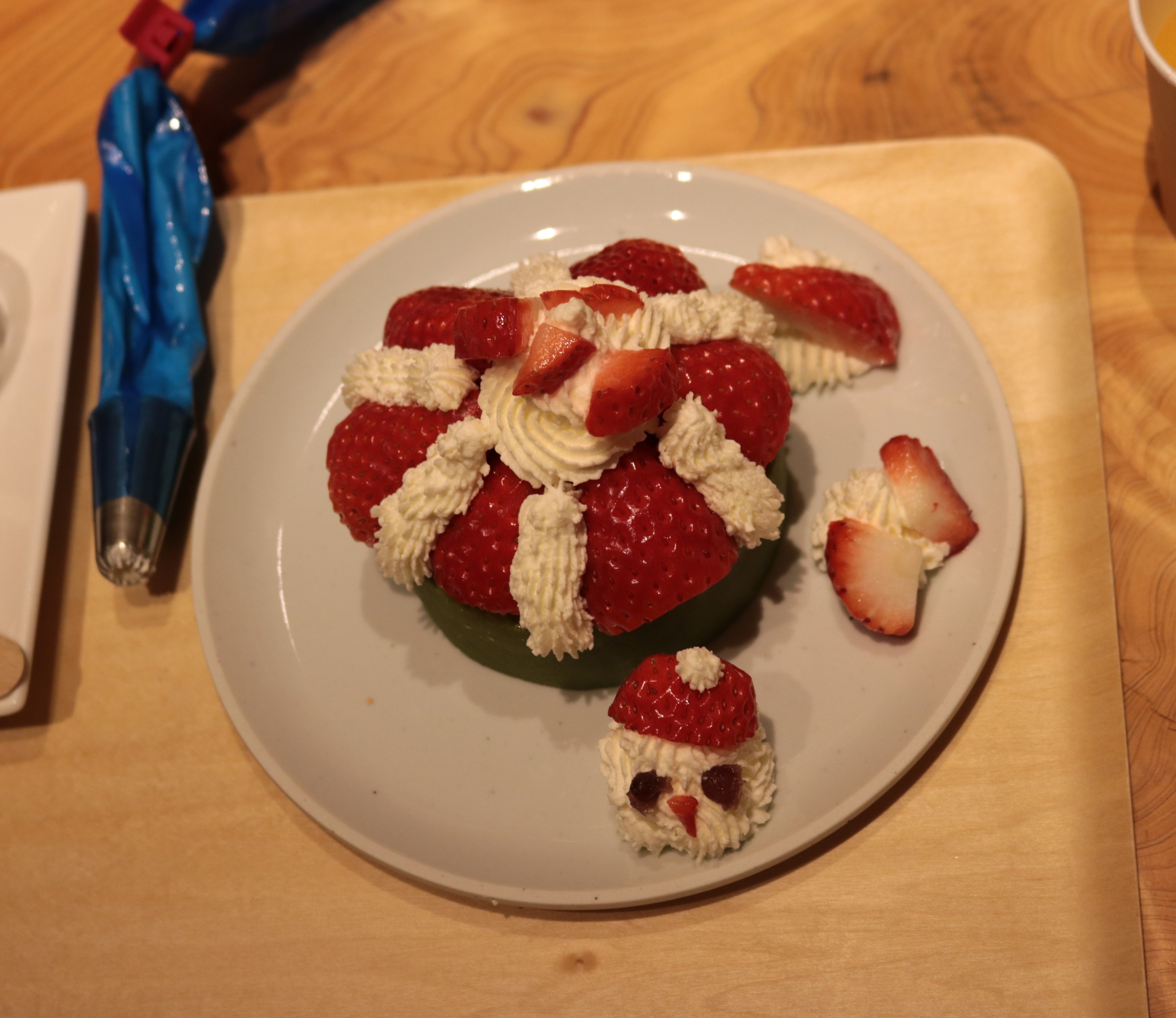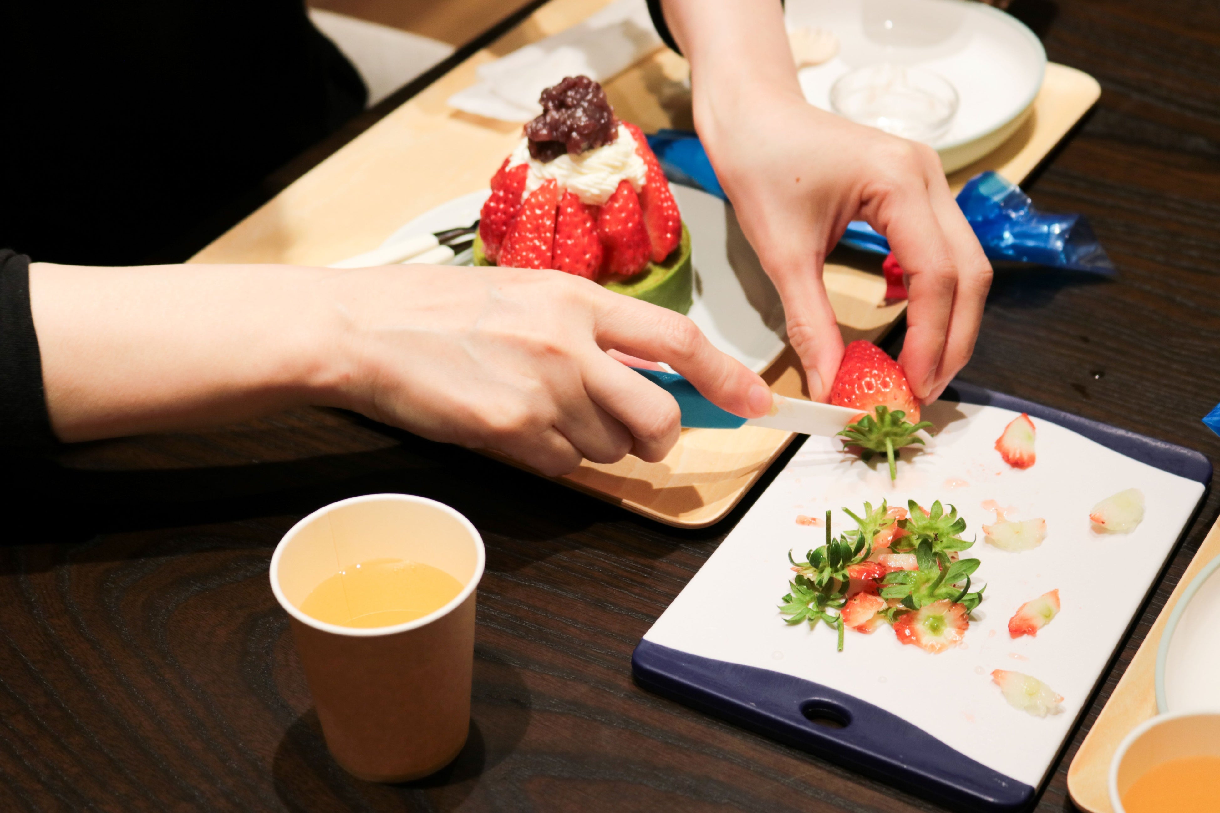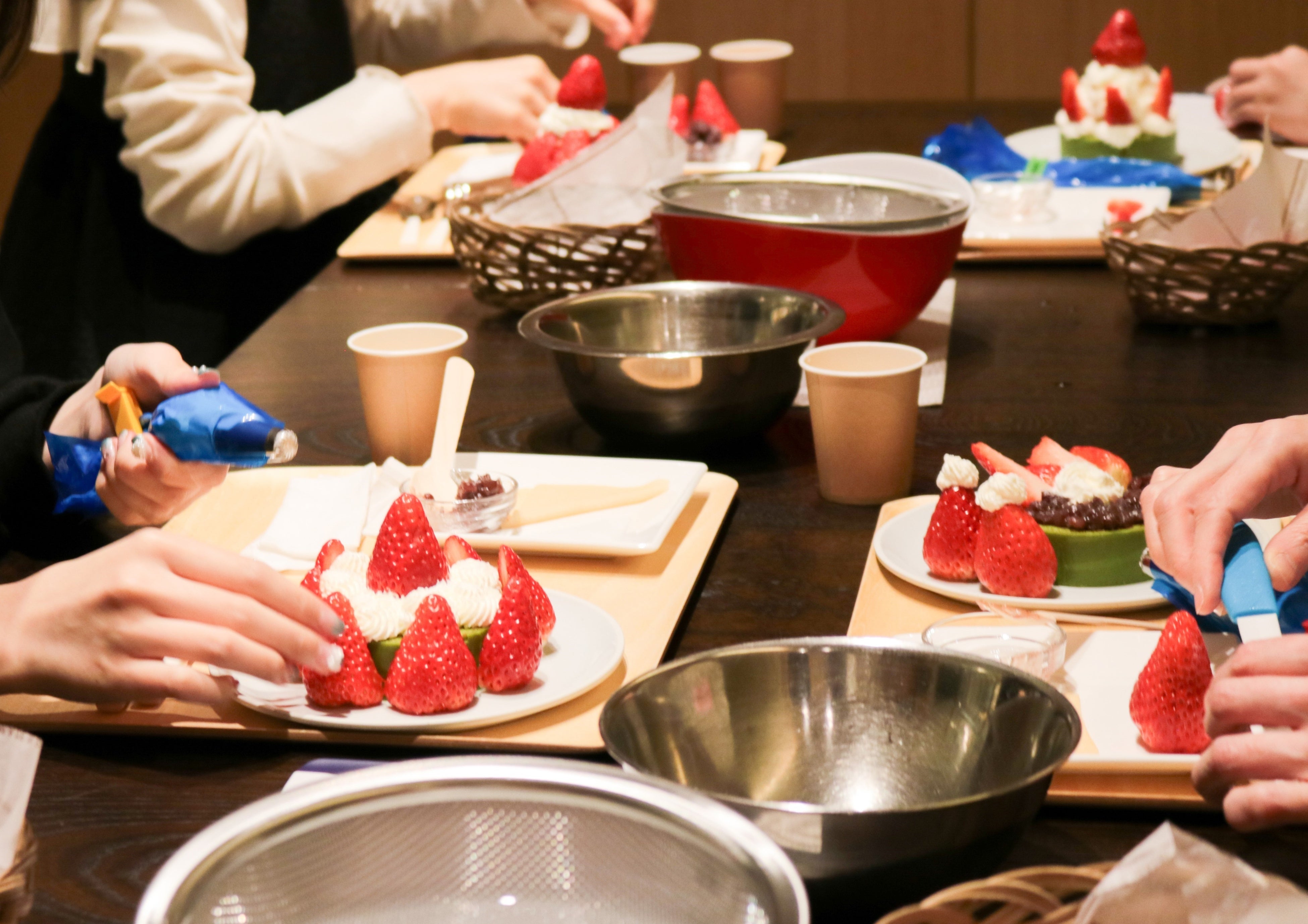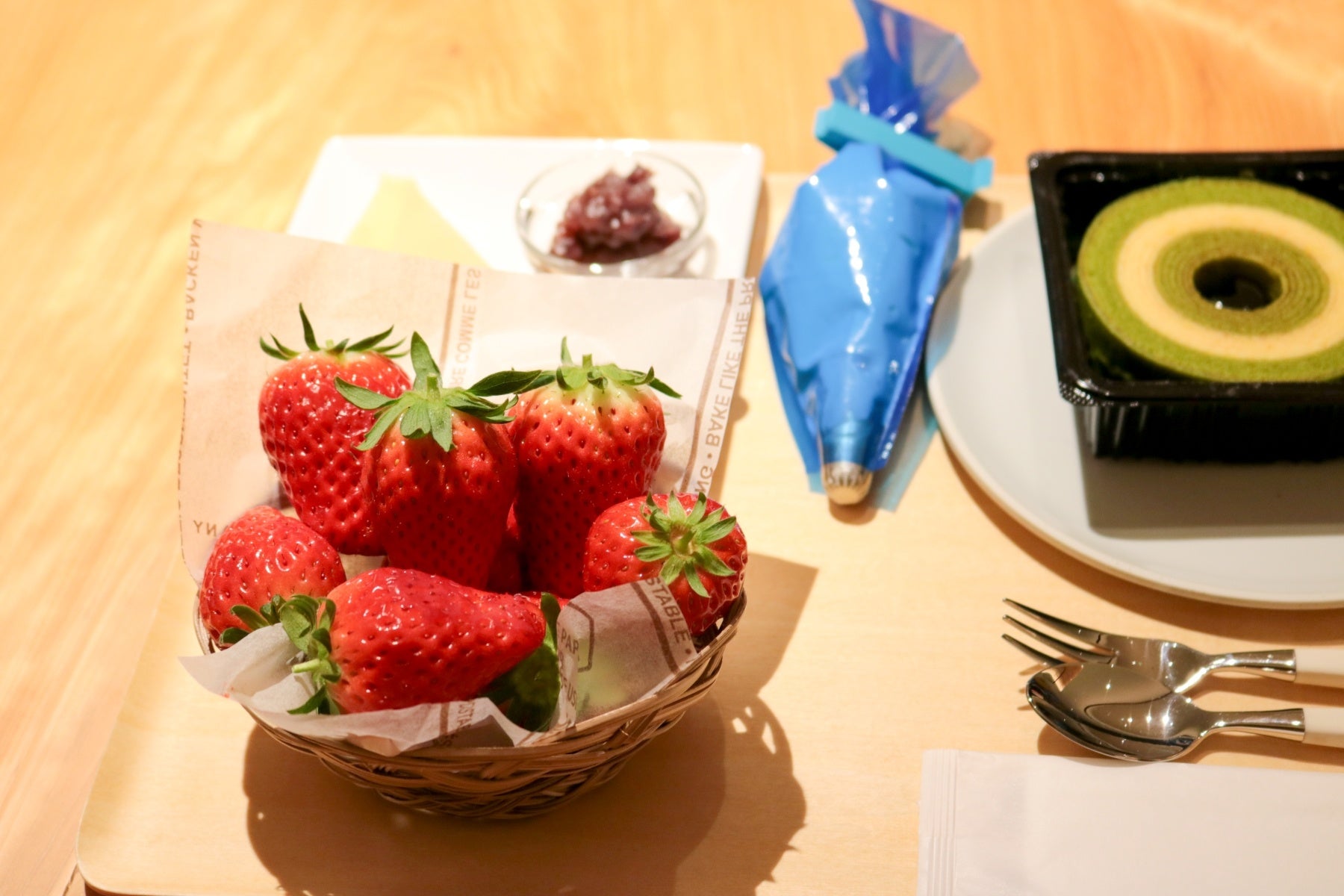 3F「京ばあむCafe」のテラスに設置したいちごプランターから8粒のいちごを摘み取り、京ばあむminiや生クリーム、あんこ、求肥を使い、好きなように盛り付けて完成させるスイーツ作り体験です。