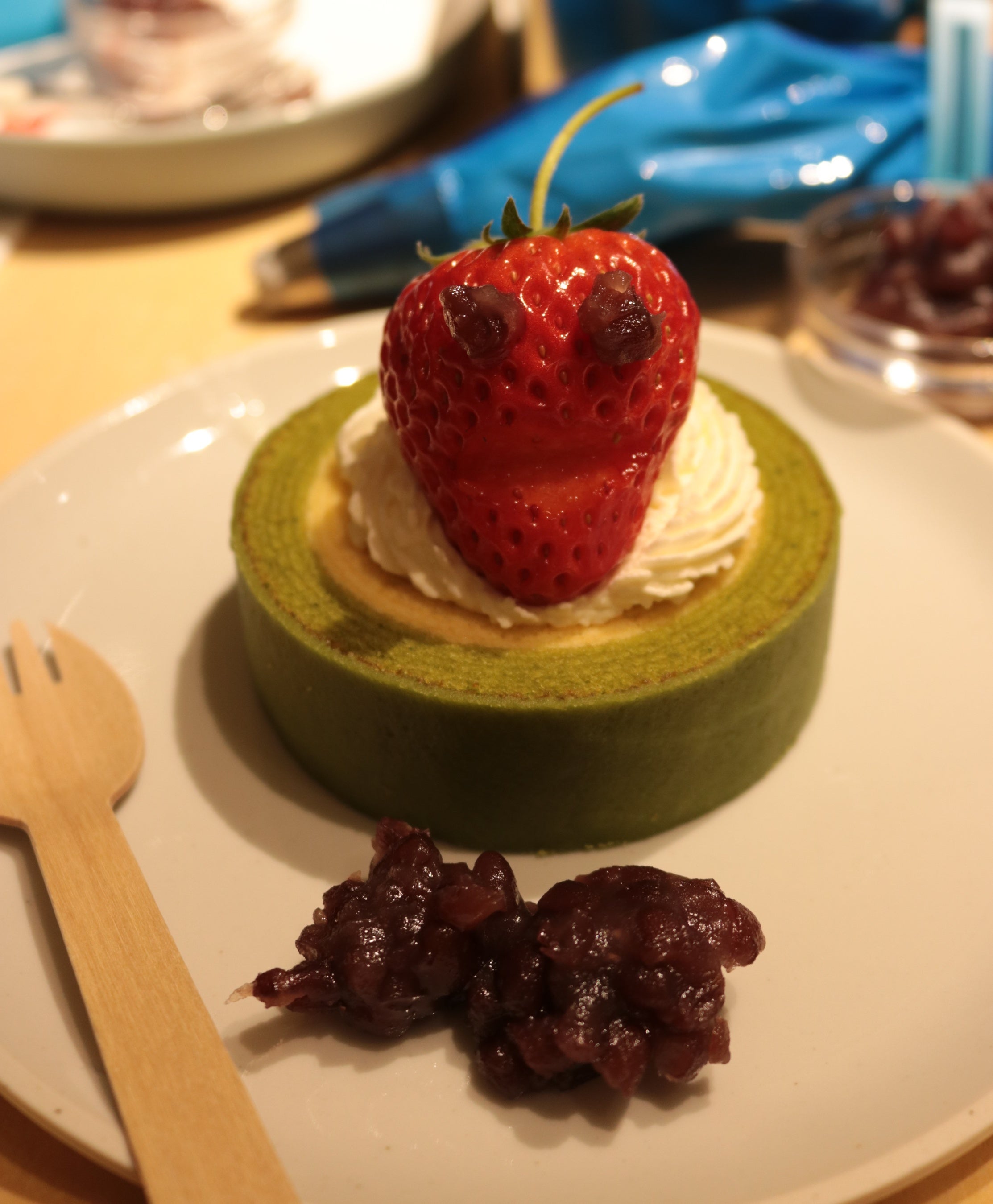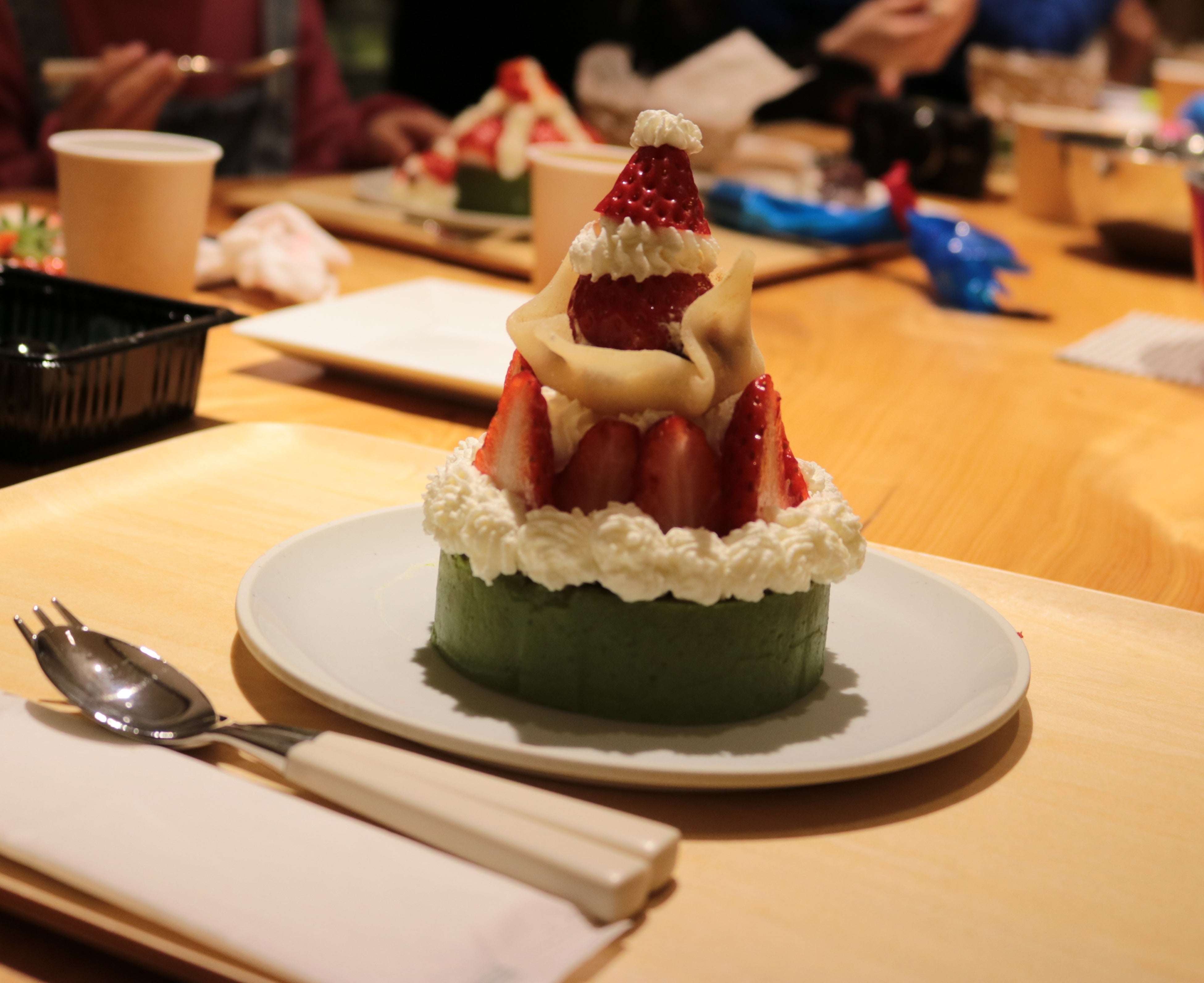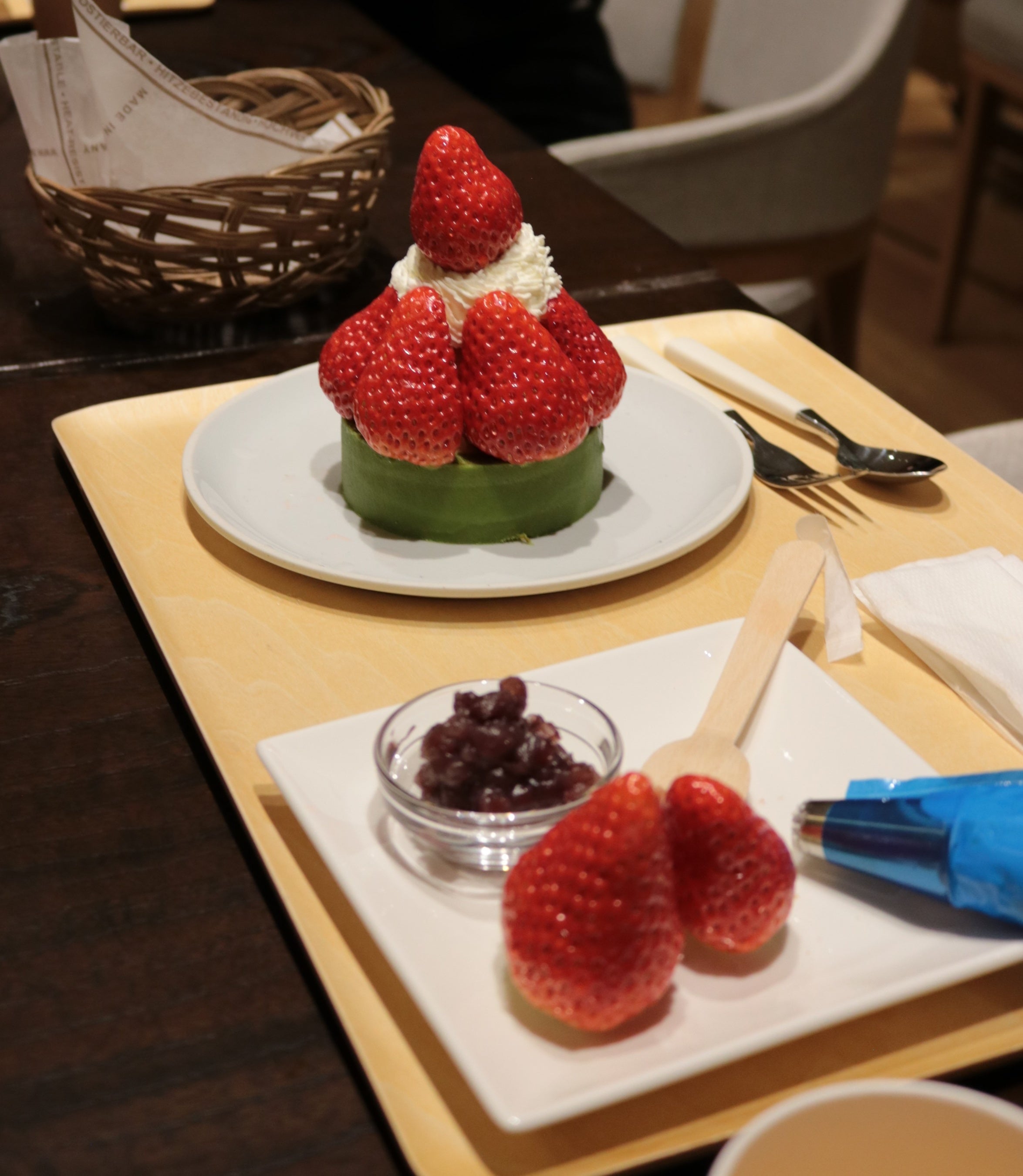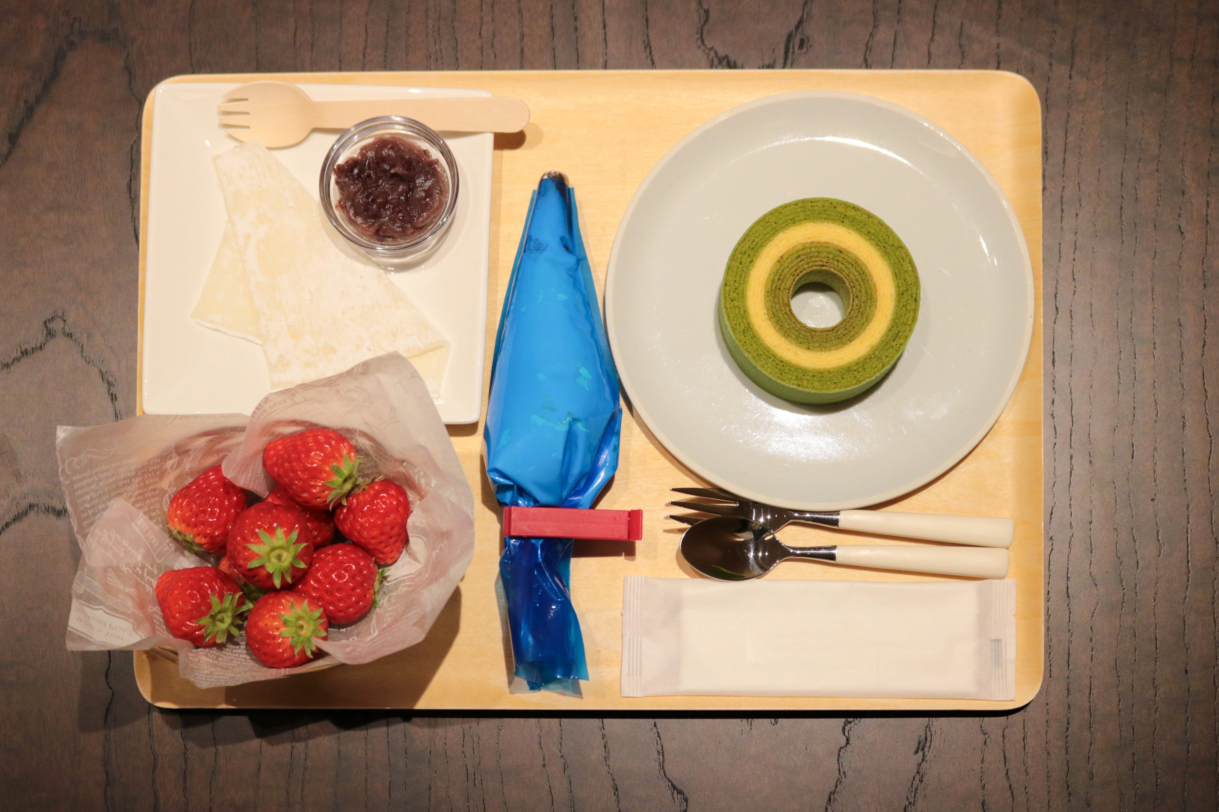 3F「京ばあむCafe」のテラスに設置したいちごプランターから8粒のいちごを摘み取り、京ばあむminiや生クリーム、あんこ、求肥を使い、好きなように盛り付けて完成させるスイーツ作り体験です。