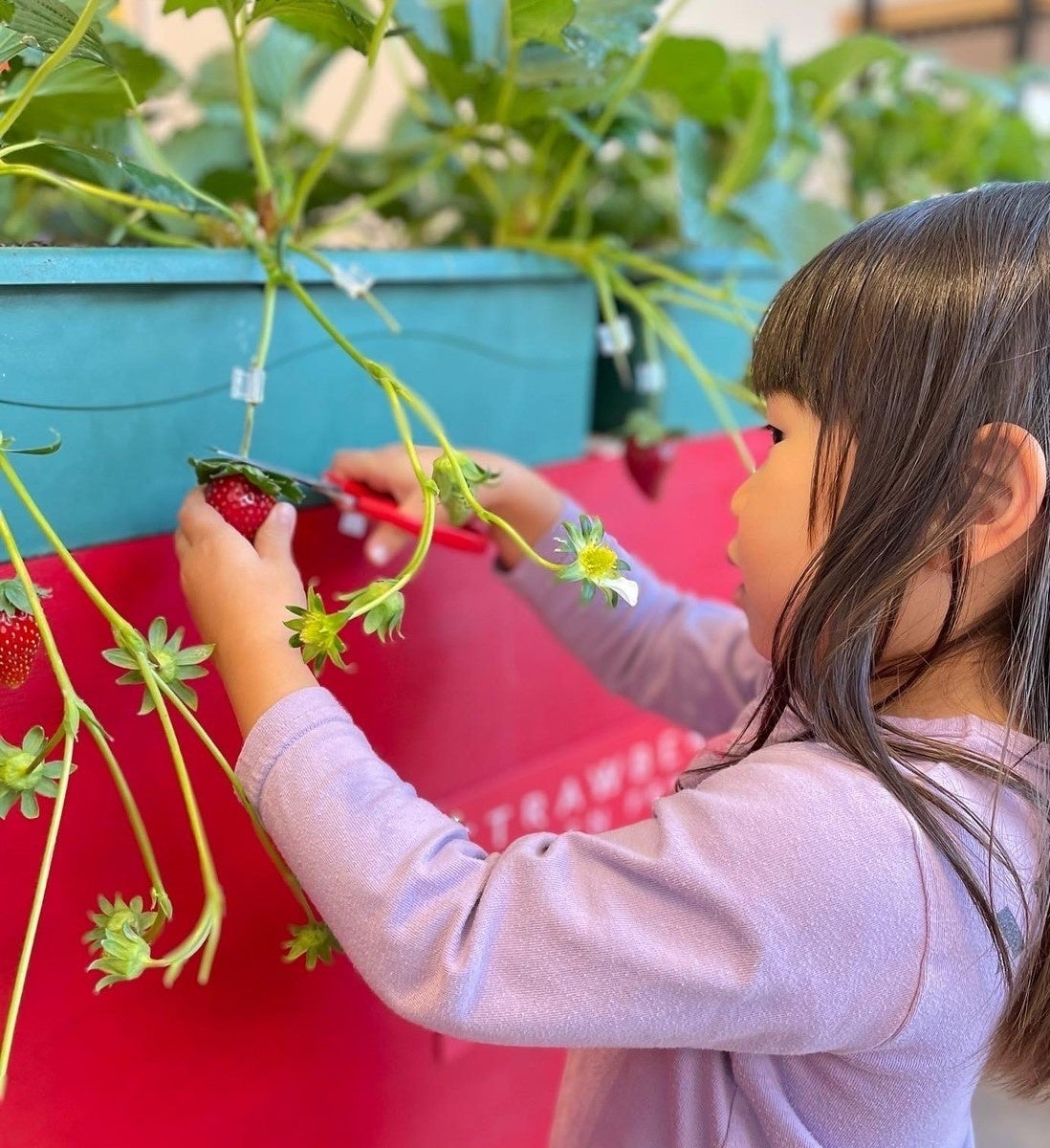 摘み取るいちごは、いちごに最適な環境でおいしさを探求する、京都府八幡市の観光農園「おさぜん農園」が育てた、「紅ほっぺ」「章姫」「おいCベリー」(※)です。 ※日により品種は異なります