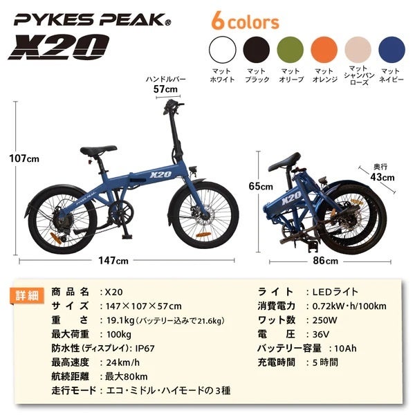 Fun Standard株式会社(本社:福岡県大野城市)の自社ブランド、PYKES PEAKから電動アシスト自転車「X20」の新色、「マットネイビー」が2022年5月より販売開始されました。最大航続距離は、業界最高値80km、急坂でもぐんぐん進む高性能。車に積めるコンパクトな折り畳み仕様で、お出掛け先にも気軽に持って行けます。通常よりお得にX20を購入可能なアウトレット商品もございます!