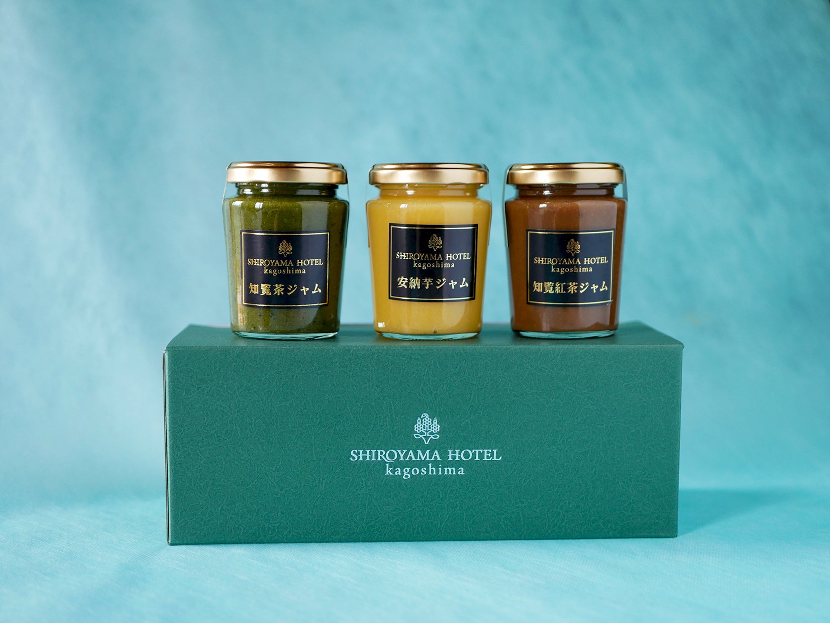 鹿児島の老舗ハイクラスホテルSHIROYAMA HOTEL kagoshimaで提供されている人気のオリジナルジャ ム。鹿児島産の食材(知覧茶・安納芋・知覧紅茶)と県内産の牛乳と合わせ、それぞれの食材の香り・味わ いを十分に活かし飽きのこないすっきりとした味に仕上げたミルクジャムです。 鹿児島の新特産品コンクールでの受賞、鹿児島のお土産として、またお取り寄せグルメとしても人気で 多数のメディアでも取り上げられています。 茶の渋みを抑えたほんのりとした甘さの 「知覧茶ジャム」、爽やかな甘さととろける食感の 「安納芋ジャム」、 ロイヤルミルクティーを想わせる優雅な風味の「知覧紅茶ジャム」3種。