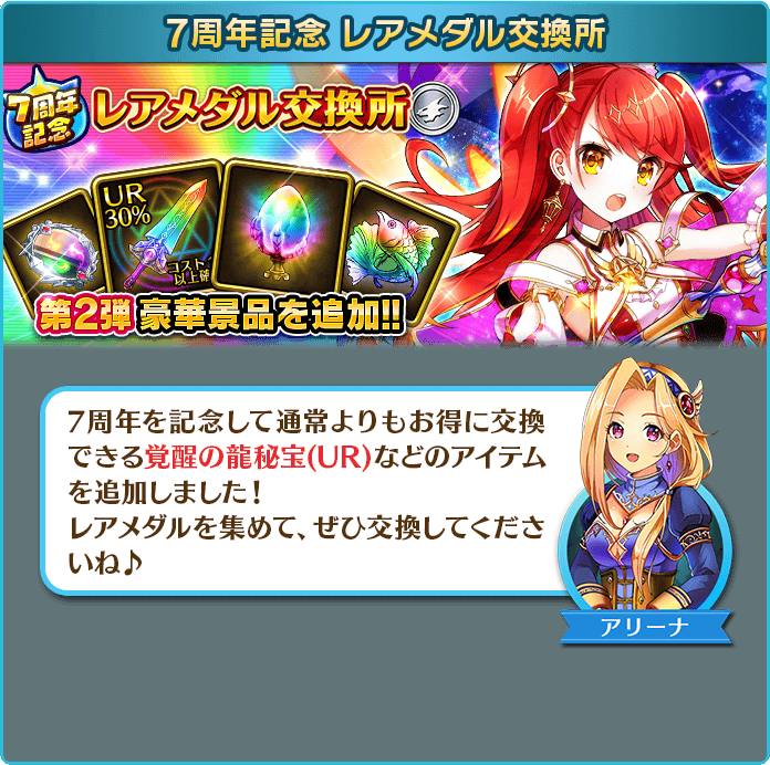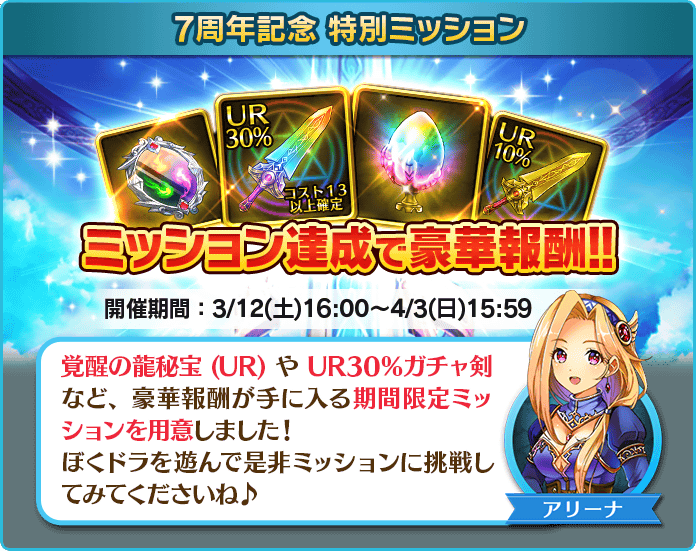 さらに今回は、対象のガチャを引くと高コストURドラゴンや豪華アイテムなどがもらえる『7周年記念くじ』が獲得できます!