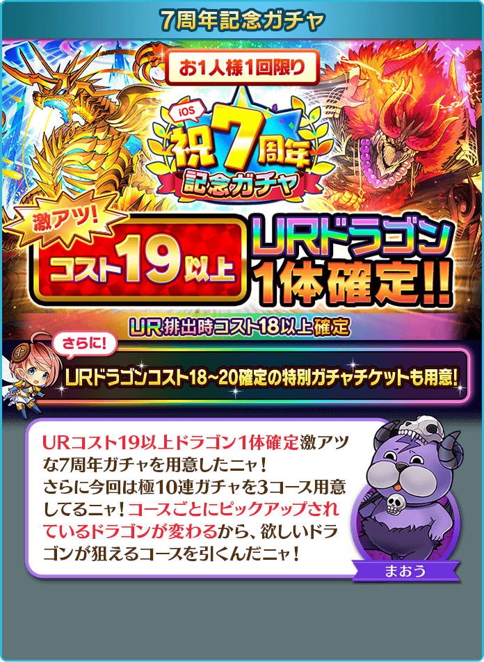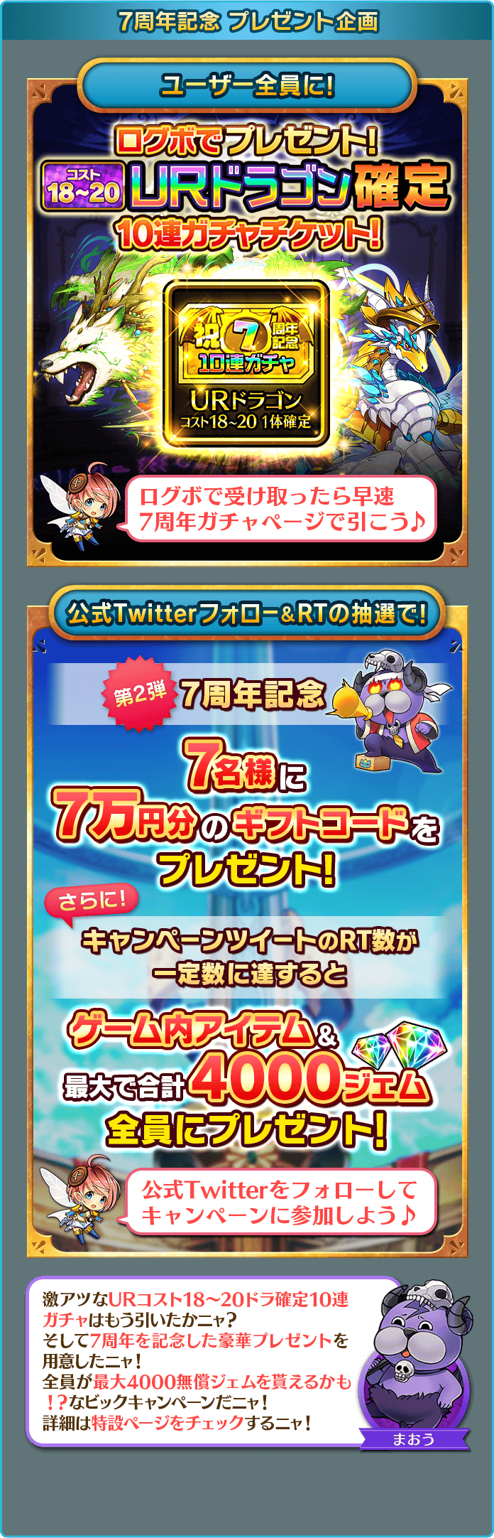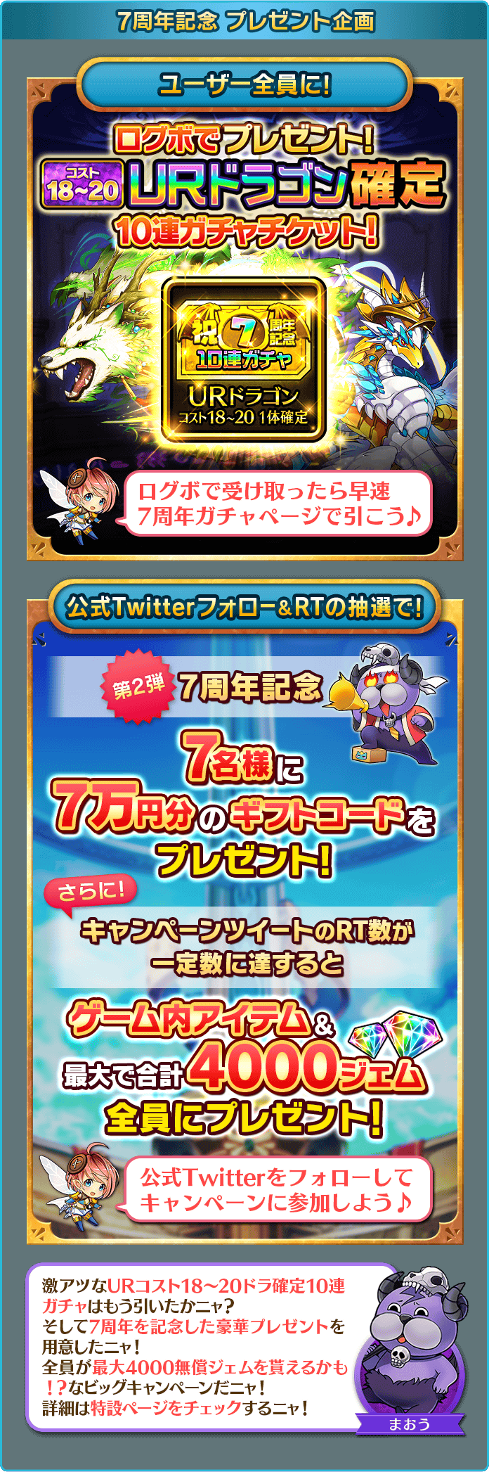 7周年記念ログインボーナスで「URコスト18~20以上ドラゴン1体確定!10連ガチャチケット」を全ユーザーにプレゼント!