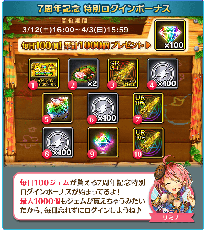 他にもUR30%ガチャ剣、最大1000個の無償ジェムなど、期間中10回ログインすることで様々な豪華アイテムを獲得できます。