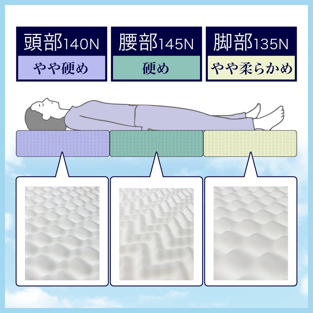 体の部位により異なるマットレスにかかる負担を分析し、 足・腰・頭に適切な硬さ・形状にした「スリーゾーンフィット構造」を開発しました。