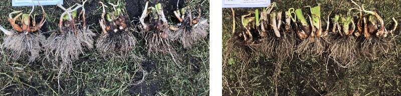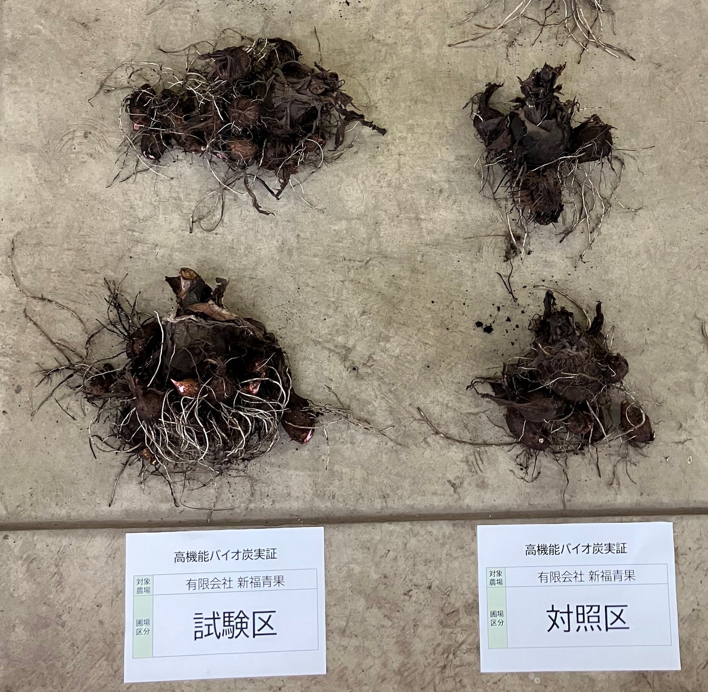 ※左(試験区)が宙炭を散布したもの、右(対照区)と比べて株の重量が増加