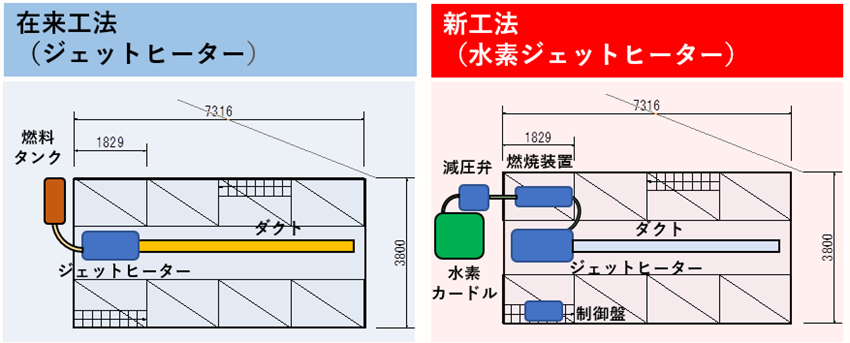 在来工法である灯油燃料としたジェットヒーターと新工法である水素ジェットヒーターを24時間連続燃焼させ、温度や燃料消費量を比較したところ実用性に問題がないことを確認しました。また、CO2