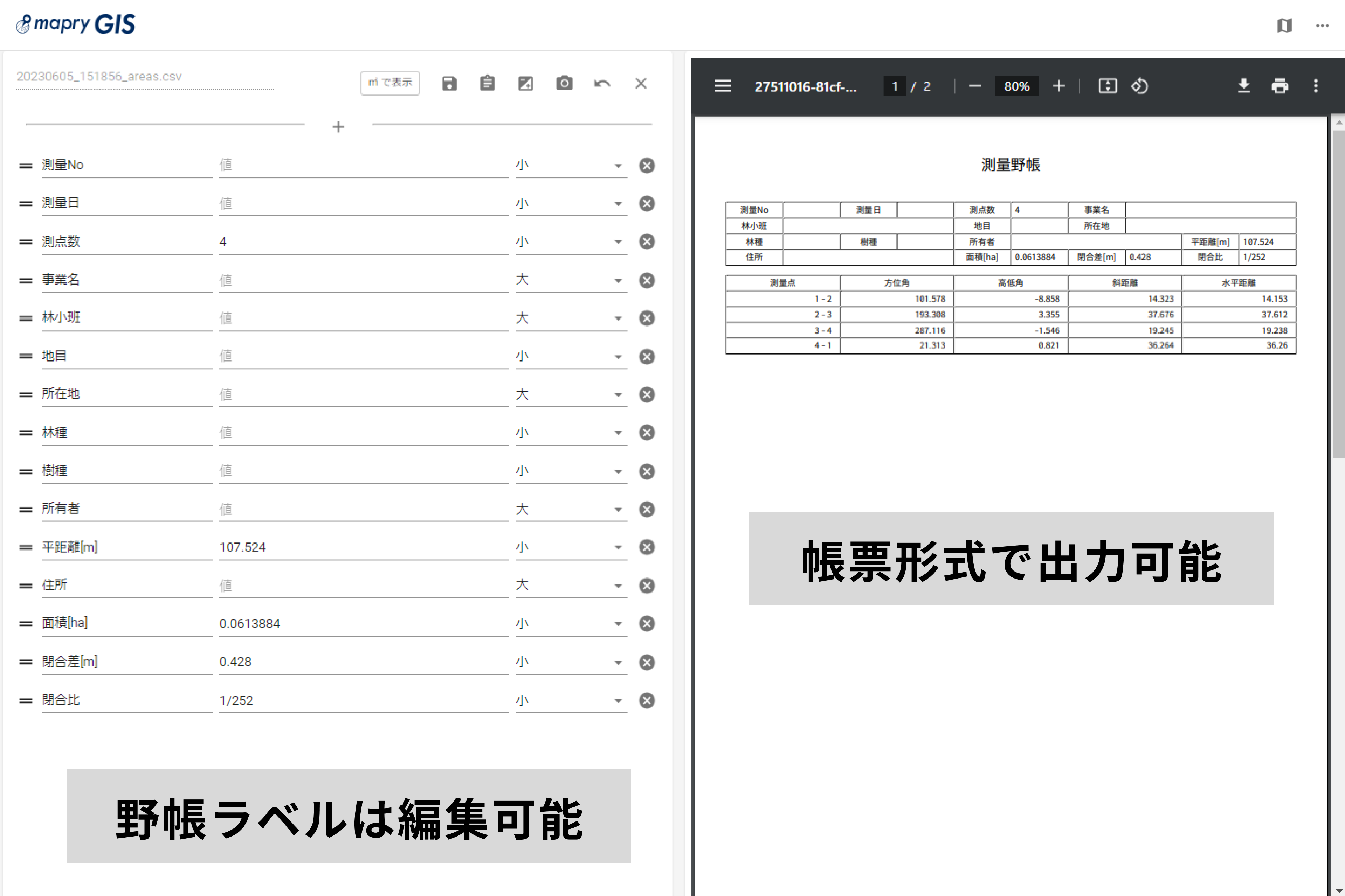 現場で計測したデータを帳票に反映/出力し、各種申請や測量野帳にご利用いただけます。