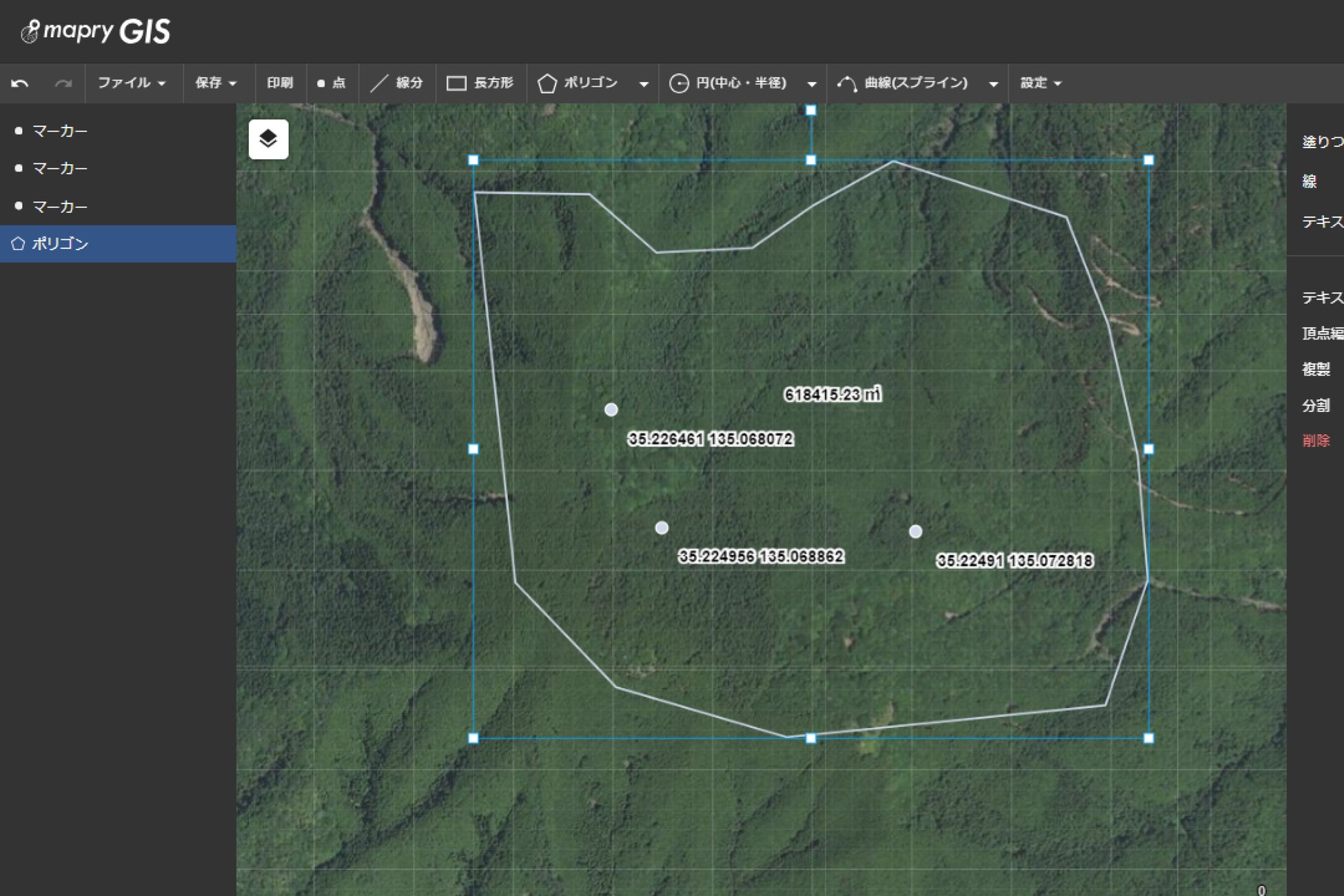 例えば、植林や間伐をする範囲のポリゴンを作成して森林整備事業での申請などにご利用いただけます。