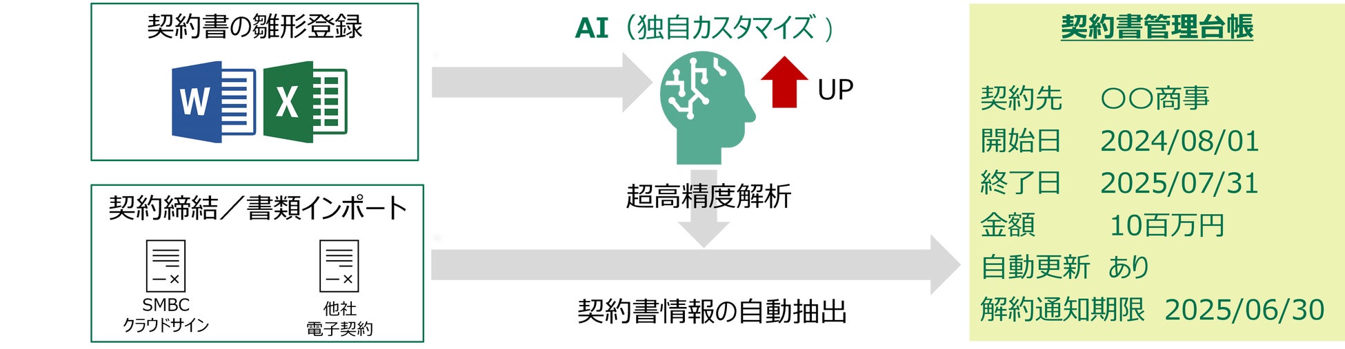| 内容 | ・ 「SMBCクラウドサイン」にて締結・インポートした契約書の情報を自動で抽出・登録するサービスです。 ・  AI契約書管理Proでは、お客さま独自の契約書の雛形に合わせた解析ロジックを提供しております。 詳細は別途SMBCCSのホームページをご参照ください。 |