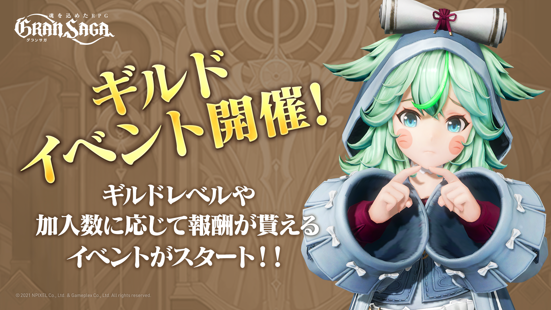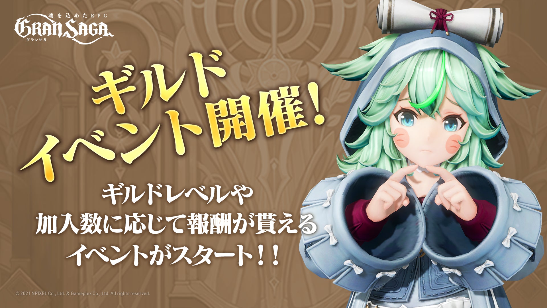 株式会社NPIXELは、クロスプラットフォーム対応の新作RPG『 グランサガ(Gran Saga)(運営:株式会社GAMEPLEX)にて、ギルドレベルに応じて豪華報酬が貰えるイベント『紡げ!ギルドの絆』や、ギルドのメンバー数に応じて報酬が貰える『集え!ギルドメンバー!』、一定のAP消費量に応じて豪華報酬が貰える『カルリッツからの指令』など、多数のイベントを本日より開催いたします!