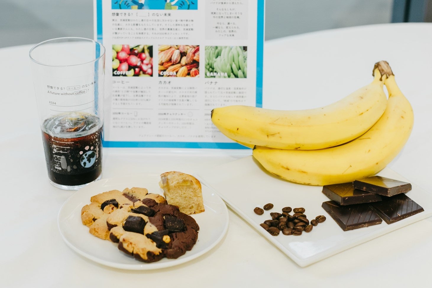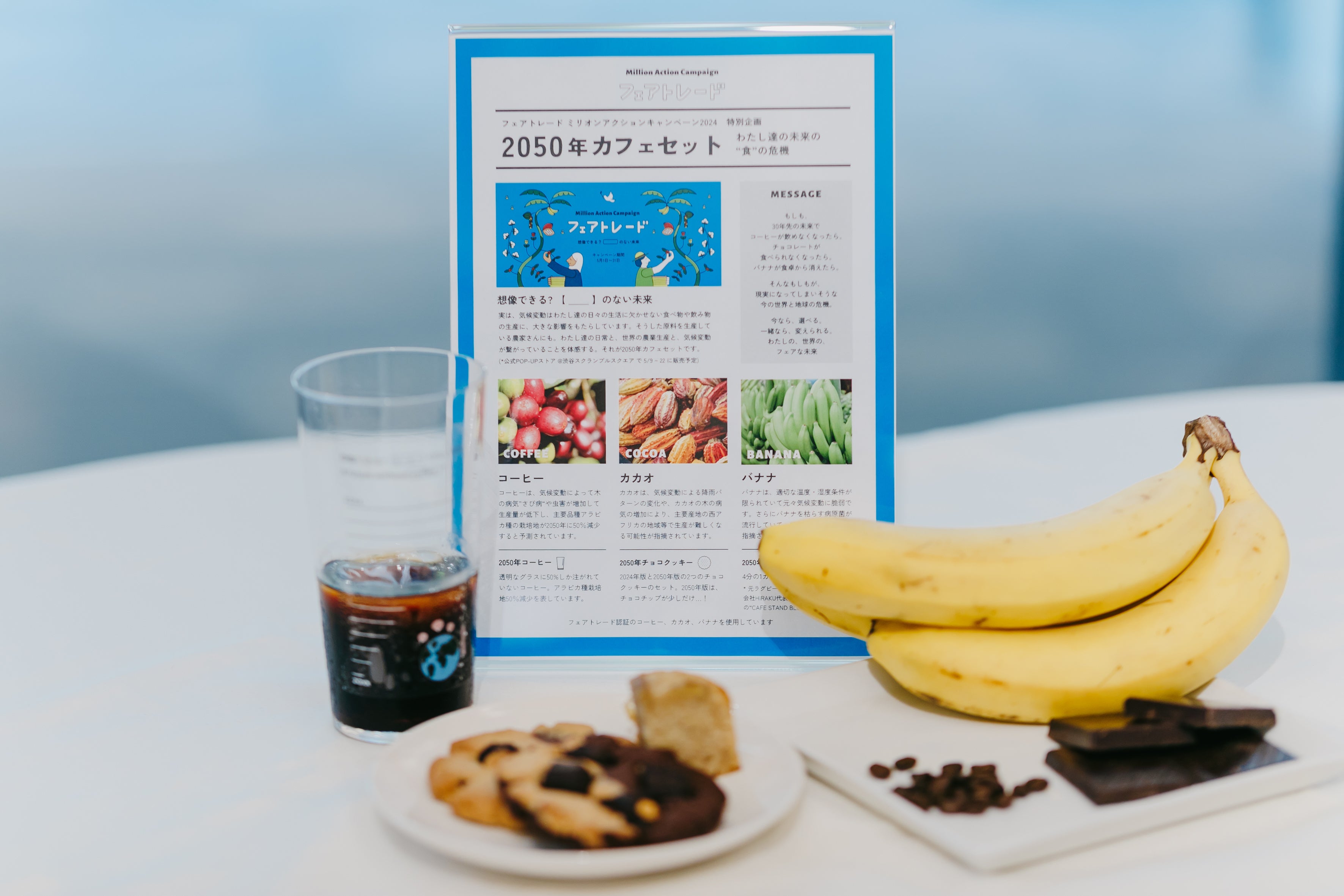 当たり前の食・日常生活がなくなってしまうかも知れない2050年の未来に目を向けることで今の世界に警鐘を鳴らし、持続可能な食品の重要性を訴えるための取り組みの一環として、グラスに半分しか入っていないコーヒーや、チョコレートの量が激減したチョコクッキーなど、2050年には食べられなくなる可能性のあるカフェメニューをイメージした「2050年カフェセット」を提供します。また、様々なフェアトレード商品を展示・販売するコーナーでは、青山学院大学との産学連携プロジェクトとして、商品セレクトや企画・当日の販売などを学生が担当。5月11日(土)の世界フェアトレード・デーには、キャンペーンアンバサダーの髙梨沙羅さんらによるトークショーなども実施します。