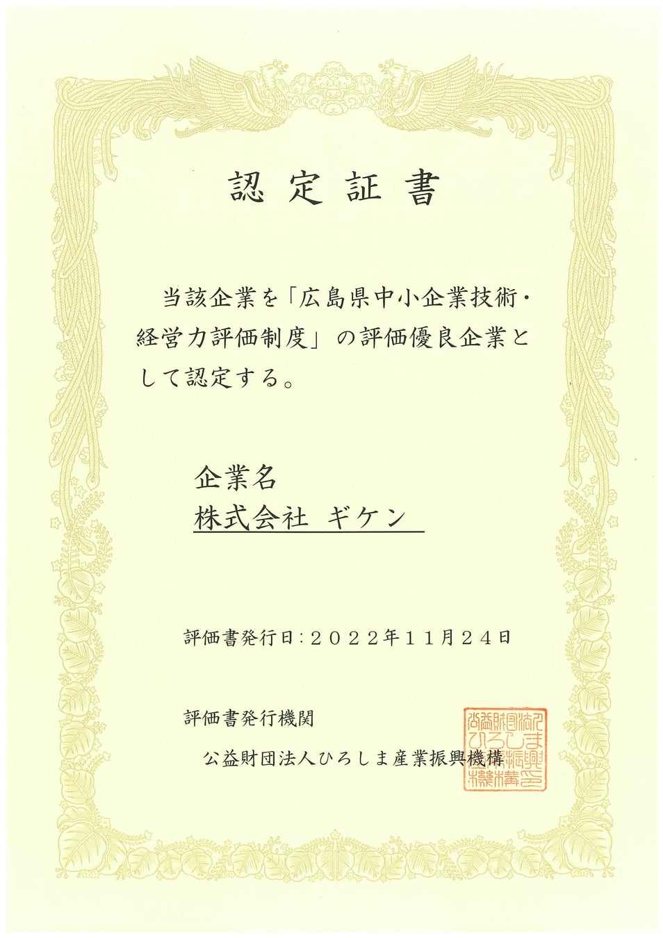広島県中小企業技術・経営力評価制度における評価優良企業に株式会社ギケンを認定