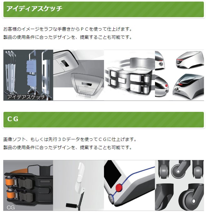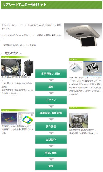 当社は、自動車関連部品をメインに樹脂部品のデザイン(アイディアスケッチ/CG、クレイモデル、ハードモデル、3Dスキャン、意匠面データ等)、設計/開発(製品設計、解析、試作、実験、評価等)、金型・冶具製作、小ロット量産までを一気通貫で対応し、自動車メーカー、電機メーカー、医療・福祉機器メーカー様などに納品しております。