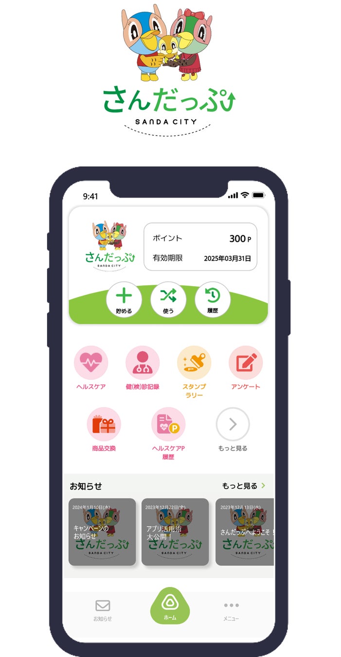 「さんだっぷ」では、日々のウォーキングや健(検)診受診、市内ウォーキングコースを活用したスタンプラリーへのチャレンジでポイントを取得し、マイナンバーカードを認証することで電子マネーなどに交換することができます。アプリに登録し、まずは外に出て歩いてみませんか?いつもの通勤電車やバスの一駅分を歩いてみたり、久しぶりに健診を受診したり、自身の健康状態を確認してみるのもいいかもしれません。