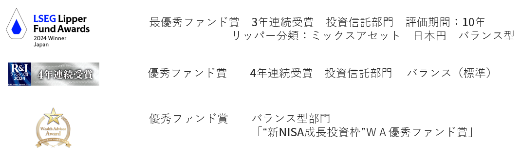 LSEG リッパー・ファンド・アワードは毎年、多くのファンドのリスク調整後リターンを比較し、評価期間中のパフォーマンスが一貫して優れているファンドと運用会社を表彰いたします。 選定に際しては、「Lipper Leader Rating (リッパー・リーダー・レーティング)システム」の中の「コンシスタント・リターン(収益 一貫性)」を用い、評価期間3年、5年、10年でリスク調整後のパフォーマンスを測定いたします。評価対象となる分類ごとに、コンシス タント・リターンが最も高いファンドにLSEG リッパー・ファンド・アワードが贈られます。詳しい情報は、lipperfundawards.comをご 覧ください。LSEG Lipperは、本資料に含まれるデータの正確性・信頼性を確保するよう合理的な努力をしていますが、それらの正確性については保証しません。
