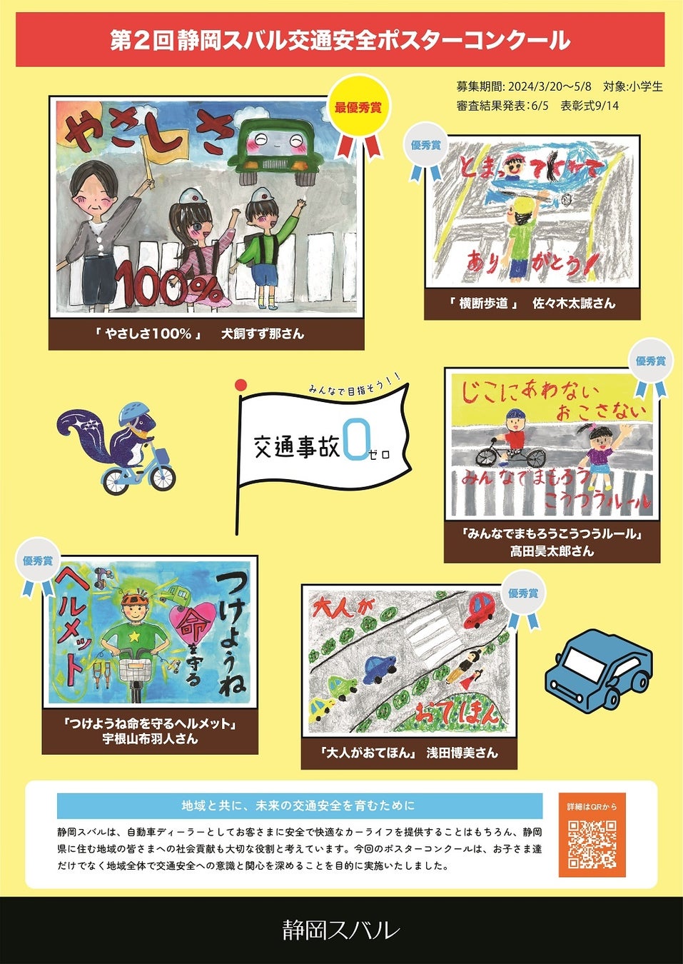 5作品をまとめたコラージュポスターを9月21日(土)から10月2日 (水)まで展示します。お客さまや地域の皆さまに静岡スバルの「安全」にかける想いと受賞5作品をご覧いただき、交通事故ゼロに向けた取り組みを広めていきます。
