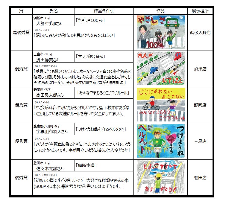 惜しくも受賞を逃した作品を含め、多くの方に子どもたちの想いを感じていただける場にしたいと考え、静岡スバル清水店に隣接した本社1階受付にて、応募された全27作品を