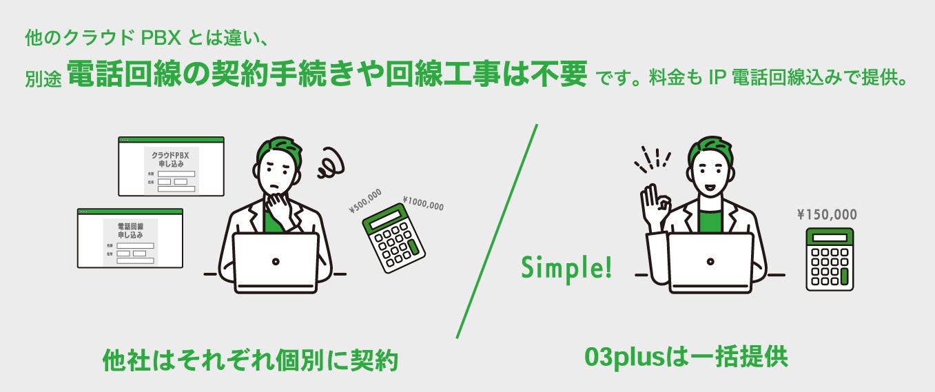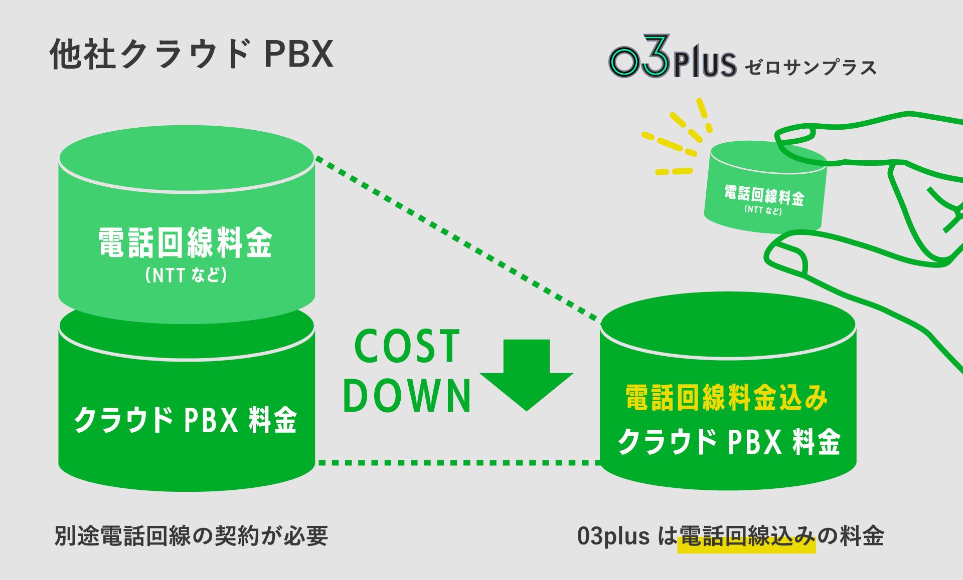 03plusのサービス基本料は「電話回線料⾦込み」のため、サービス料⾦とは別に電話回線料⾦がかかる他のクラウドPBXに⽐べ、ランニングコストを抑えることが可能です。