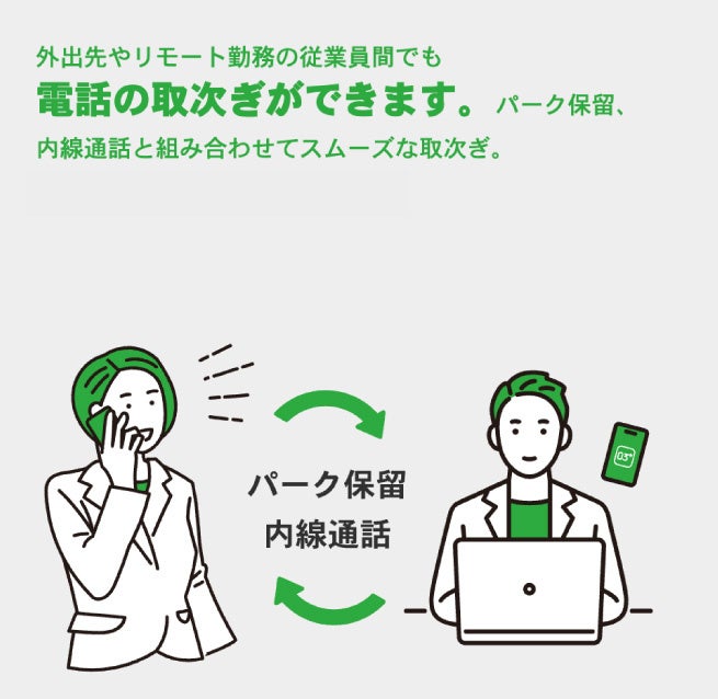 03plusは外出先でもスマホで電話応対ができるため、⼩規模な店舗や事務所など従業員が事務所に不在になりがちなケースでも電話の取り逃しリスクを削減します。また、外出中・テレワーク中の従業員のスマホへ内線電話をかけたり、お客様からの電話を取り次ぐこともできます。