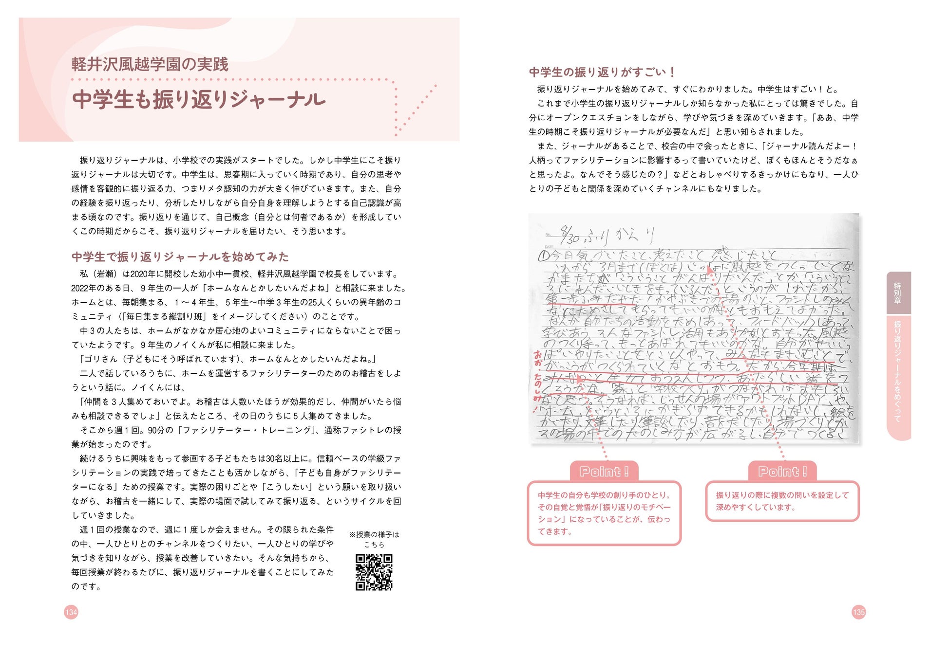 1章~5章では小学校での振り返りジャーナルの実践を紹介してきましたが、じつは中学校以降であっても振り返りジャーナルは有効です。特別章では、業界注目の軽井沢風越学園での振り返りジャーナルの実践例をお見せします。また、GIGAスクール構想の下で整備された1人1台端末と振り返りジャーナル、子どもの頃に取り組んだ先生・実践者などの声など、振り返りジャーナルのあれこれを増補版としてお届けします。