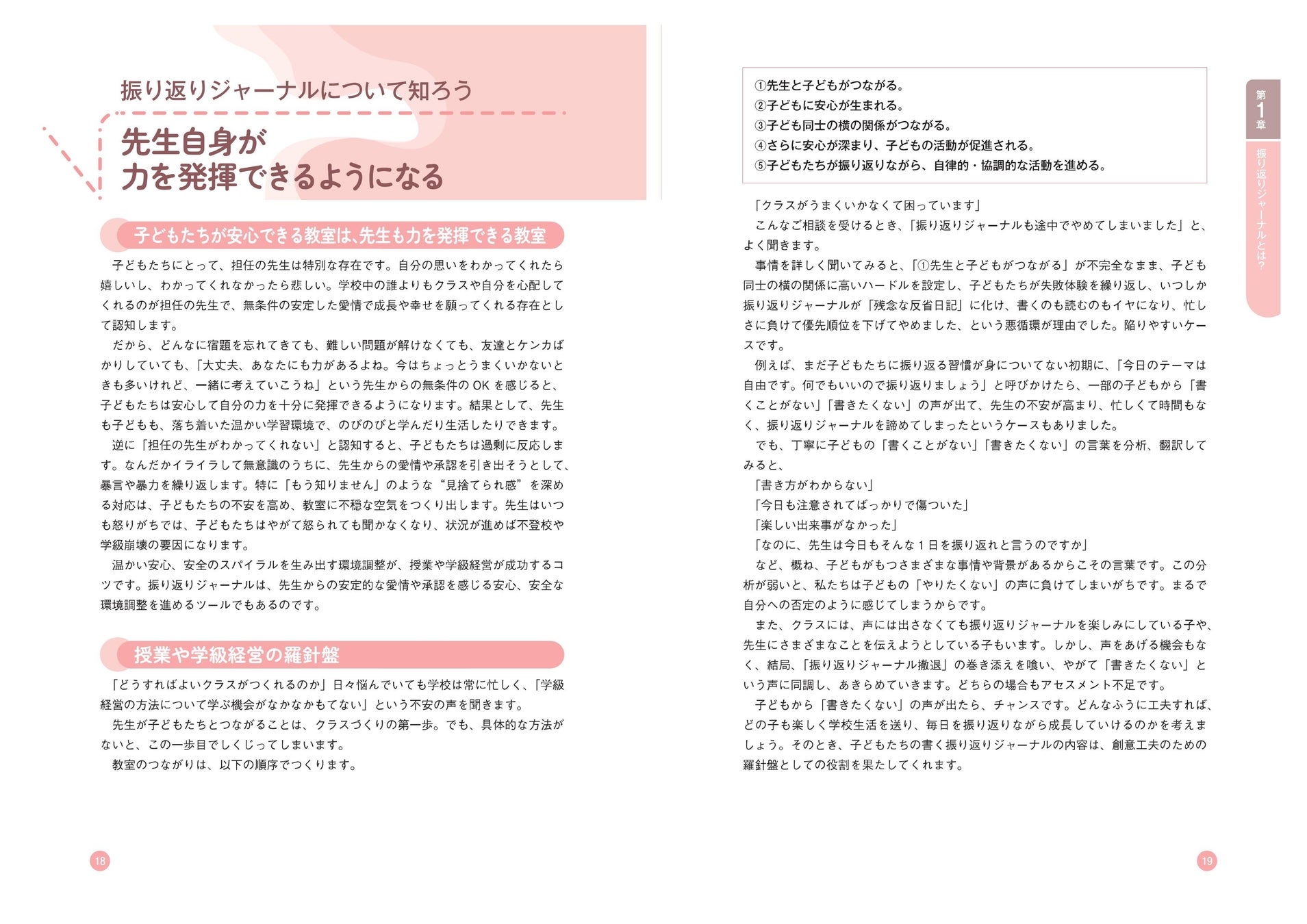 振り返りジャーナルは、子どもの成長を促すとともに、先生と子どもたちとを信頼でつなぐチャンネルとなるツールです。1章では振り返りジャーナルでなぜ子どもたちが成長するのか、学級経営にどのように役立つのかを解説します。