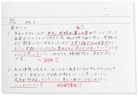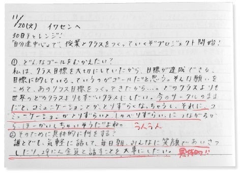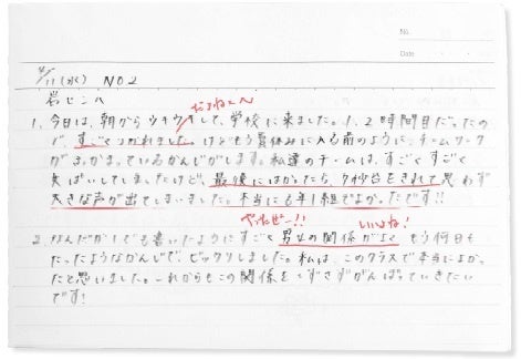 その日の出来事を振り返り半裁のノートに記録することで、子どもの書く力やメタ認知する力、習慣の力を育てることができます。先生にとっては、かかわりが多くなる子だけでなく、まったく会話するチャンスのないまま下校した子の1日にも寄り添えることで、円滑な学級経営のツールとなります。さらに直接的ではなくとも、子どもたちとのつながりを保つことで先生からの安定的な愛情や承認を感じる安心、安全な環境調整を進めることができます。